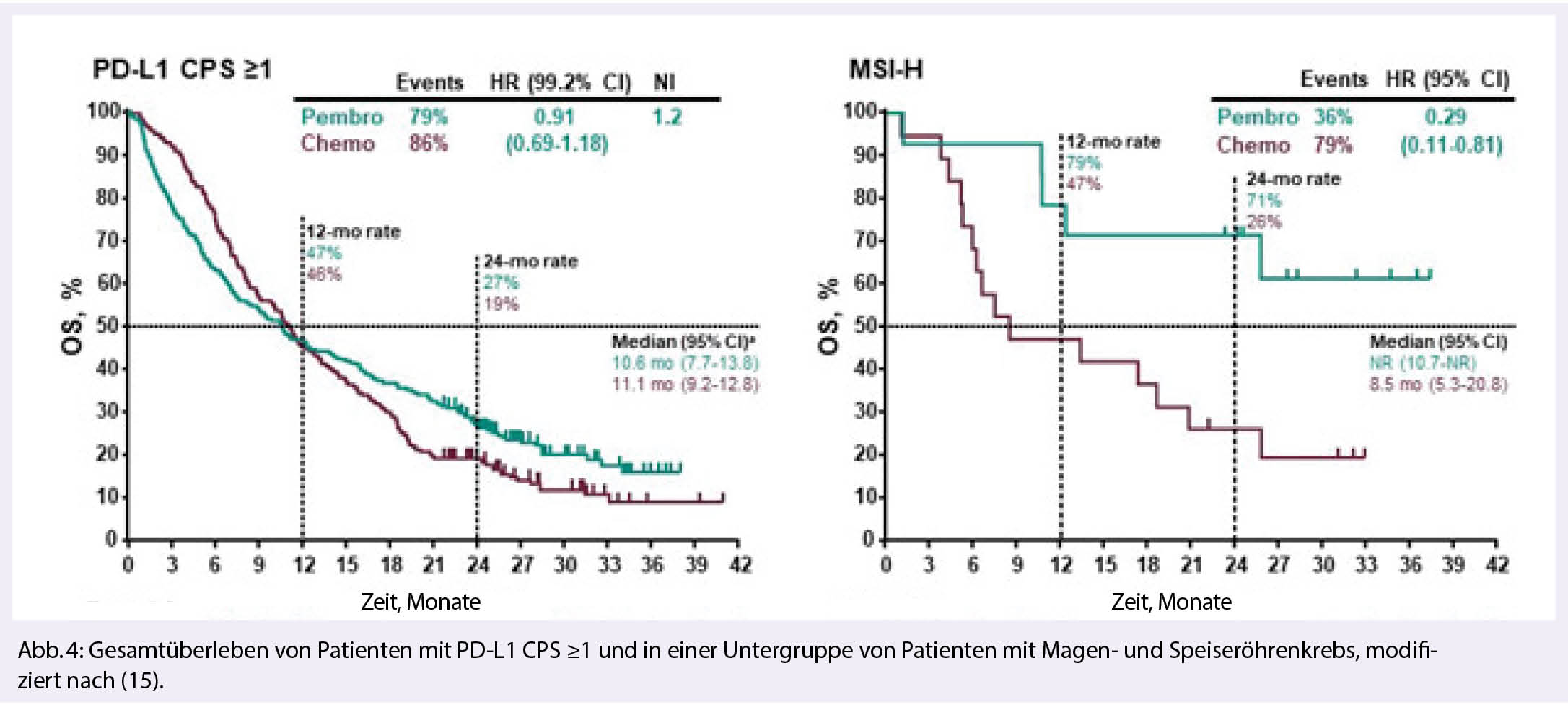 Beim metastasierten Magen/GEJ Karzinom wurden zunächst enttäuschende Daten der KEYNOTE 062 Studie (16) präsentiert. Der Vergleich des Chemoarms mit dem Kombinationsarm Chemo plus Pembrolizumab führte zu keiner Verbesserung des OS. Die später gezeigten Subgruppenanalysen relativieren jedoch deutlich. Insbesondere die MSI high Patienten profitieren deutlich von der Zugabe des PDL-1 Inhibitors. Klarer ist das Bild beim Vergleich Immuntherapie versus Chemo, nebst den MSH-high Tumoren konnten auch die CPS>10 mit verbesserten OS profitieren (Abb. 4).