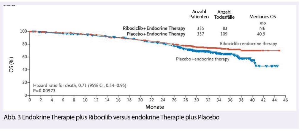 Die CDK4/6-Inhibitoren haben in der Behandlung des hormonrezeptorpositiven metastasierten Mammakarzinoms eine eindrückliche Verbesserung des PFS gezeigt (10). Dies wurde auch in der Monaleesa-7 Studie bestätigt, welche den Effekt nun auch bei prämenopausalen Patientinnen zeigte (Abb. 3). Die endokrine Therapie in Kombination mit Ribociclib verbesserte das PFS von 13 auf 23.8 Monate (HR 0.55). Am ASCO in diesem Jahr wurden nun auch die OS-Daten präsentiert, welche ebenfalls positiv sind mit einer Verbesserung des OS nach 42 Monaten von 46% auf 70.2% (HR 0.71).
