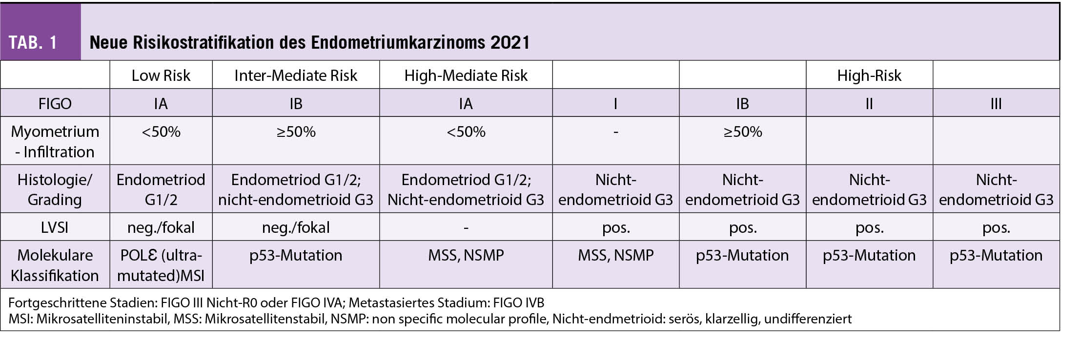 Die Einteilung aufgrund histologischer Subtypen (früher Typ 1: endometrioid, verbunden mit Übergewicht, Hormonrezeptor-Überexpression, günstiger Prognose, sowie Typ II: hauptsächlich seröse Histologie, schlechte Prognose) ist ungenügend, um das Rezidivrisiko akkurat abschätzen zu können (3). Das hat zur Weiterentwicklung der Bestimmung molekularer Eigenschaften des Endometriumkarzinoms geführt. Das Ziel ist, die Prognose dieser Patientinnen zu verbessern und die Therapien masszuschneidern. Im Sinne einer De-Eskalation werden möglicherweise sogenannte Standard-Therapien nicht (mehr) indiziert werden. Die Subgruppe der Patientinnen mit Polymerase epsilon (POLƐ)-Mutationen haben zum Beispiel eine exzellente Prognose und werden, wenn nicht als solche identifiziert, möglicherweise überbehandelt (Tab. 1). Ob die günstige Prognose allerdings aufgrund des sehr guten Therapie-Ansprechens oder der Verlauf tatsächlich auch spontan hervorragend wäre, ist zur Zeit unklar. Andererseits sind Tumoren mit p53-Dysfunktion prognostisch ungünstig mit genomischer Instabilität und rascher Tumorprogression (4).