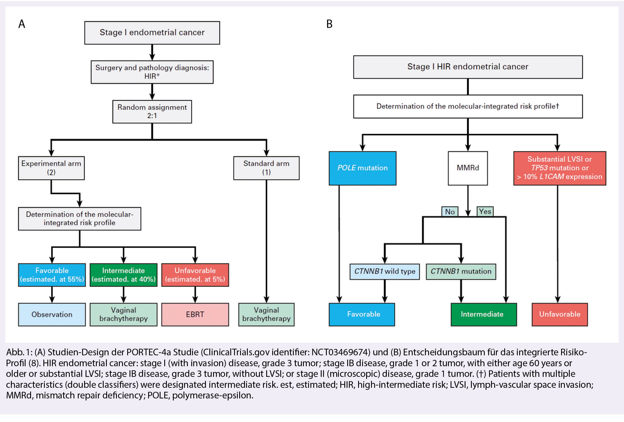2021 wurden die aktualisierten ESGO-ESTRO-ESP – Guidelines zur Behandlung des Endometriumkarzinoms publiziert , worin die neuen Definitionen der Risikogruppen bereits aufgenommen wurden. Diese prognostischen Faktoren sind von grosser Bedeutung. Noch stehen uns keine robusten Daten zu prädiktiven Aussagen zur Verfügung. Die retrospektive Analyse der PORTEC3-Studie zeigte beispielsweise bei MMRd-Patientinnen mit adjuvanter Radiotherapie keine Prognoseverbesserung durch die Zugabe einer adjuvanten Chemotherapie. Diese Daten basieren jedoch auf der geringen Zahl von 2 x 70 Patientinnen. Diese wichtigen Daten werden zur Zeit in grossen Phase III-Studien erhoben, wie zum Beispiel in der PORTEC 4a-Studie (ClinicalTrials.gov Identifier: NCT03469674) (8). In dieser internationalen, prospektiven Studie werden Patientinnen mit high-intermediate Risiko-Endometriumkarzinomen randomisiert zu einer individuellen Behandlung, basierend auf molekularpathologischen Eigenschaften, versus der Standardbehandlung, welche auf herkömmlichen kliniko-pathologischen Empfehlungen beruht (s. Abb. 1). Die Patientinnen werden nach der Operation entweder weiter beobachtet ohne Therapie oder erhalten eine Brachytherapie oder eine perkutane Radiotherapie. Im weiteren sollen die molekularen Erkenntnisse aus der PORTEC 3-Studien-Population (TransPORTEC ) in einem komprehensiven internationalen Projekt bezüglich molekularer Risikostratifizierung unterschiedlichen, eben personalisierten adjuvanten Therapien zugeführt werden (Refining Adjuvant treatment IN endometrial cancer Based On molecular features (RAINBO Projekt), TransPORTEC platform trials). Die Planung und Finanzierung dieser grossen internationalen Studie läuft auf Hochtouren. Erste Patientinnen sollen 2022 eingeschlossen werden können. In der Schweiz wird dies im Rahmen unserer kooperativen Forschungsgruppe, der Schweizerische Arbeitsgruppe für Klinische Krebsforschung (SAKK), möglich sein. Alle diese Resultate werden mit Ungeduld erwartet und werden uns der Präzisionsmedizin grosse Schritte weiterbringen.