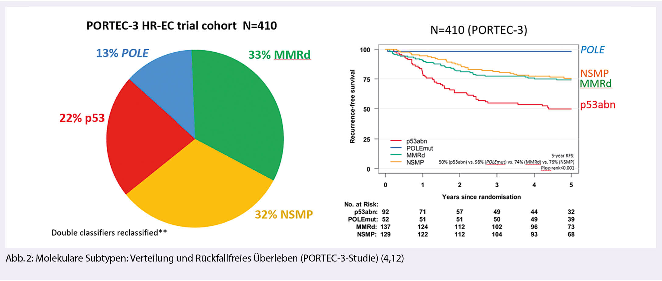 Im Jahr 2013 wurde der Cancer Genome Atlas (TCGA) zum Endometriumkarzinom publiziert, ein Durchbruch in der Klassifikation des Endometriumkarzinoms (5). Vier molekulare Subklassen mit unterschiedlicher Prognose wurden identifiziert. Retrospektive Untersuchungen an Adjuvant-Studien beim Endometriumkarzinom (Post-Operative Radiation Therapy in Endometrial Carcinoma PORTEC- 1, 2 und 3-Studien) entsprechend der molekularen Subtypsierung konnten zeigen, dass histologisch aggressive Tumore bei POLƐ-Mutation eine sehr gute Prognose mit geringem Rückfallrisiko aufweisen gegenüber anderen Subtypen mit gleicher Histologie (4). Betrachtet man ausschliesslich die G3-Tumoren, findet sich eine POLƐ-Mutation in 12%, eine MMMR-Defizienz in 40%, p53-Mutation in 18% und NSMP in 30% aller Karzinome (6).