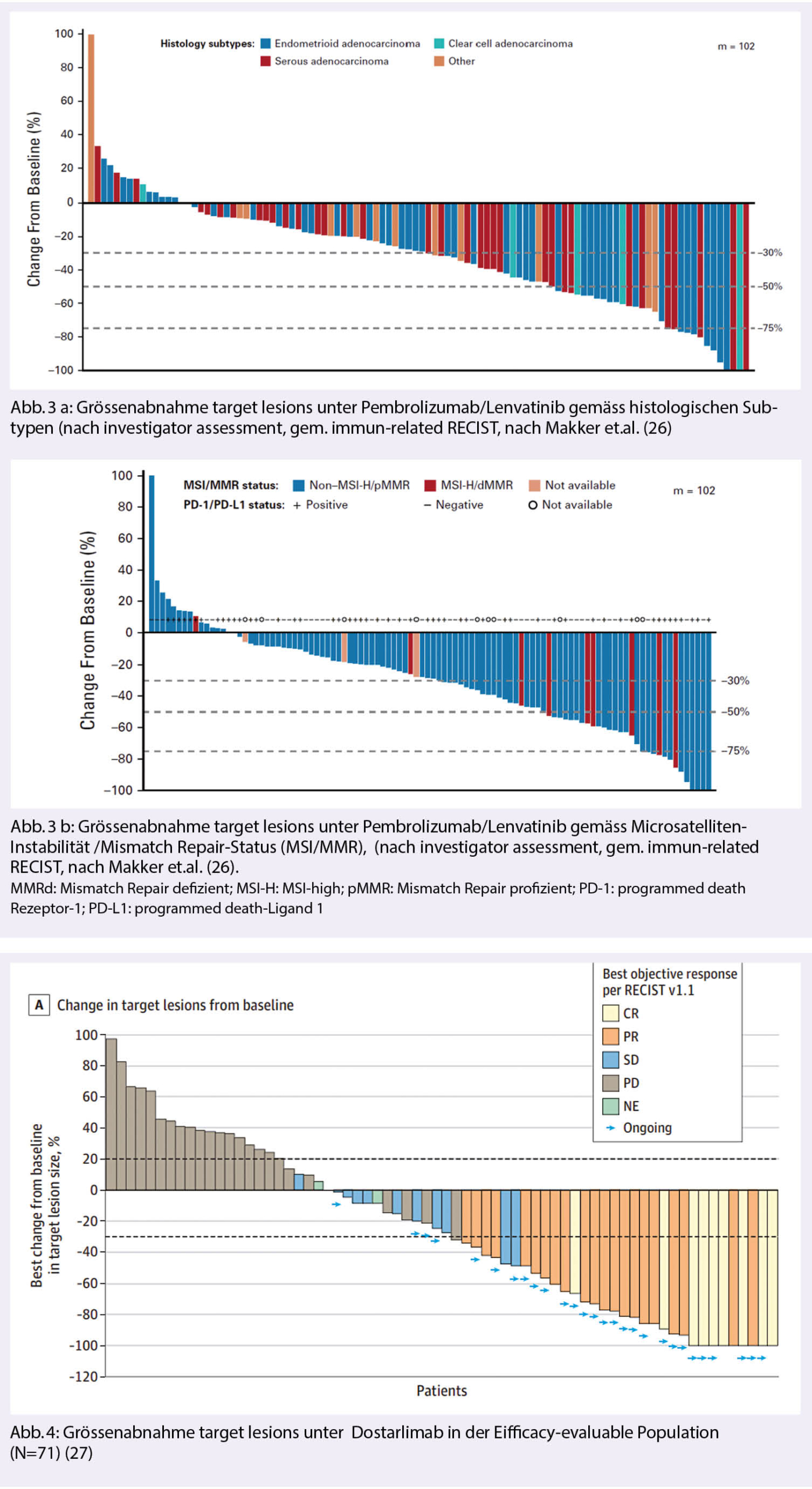Jemperli® wurde in einer Dosierung von 500 mg iv alle 3 Wochen für 4 Dosen, gefolgt von 1000 mg iv alle 6 Wochen, verabreicht. Die overall response rate (ORR) war bei diesen vor-behandelten Patientinnen hoch mit 42.3% (95% CI: 30.6%, 54.6%), die mittlere Dauer des Ansprechens (duration of response DOR) war nicht erreicht; 93.3% der Patientinnen zeigten nämlich ein Ansprechen ≥ 6 Monate (Range: 2.6 – 22.4 Monate, es war ongoing beim letzten Assessment). Die Nebenwirkungen waren mit 34% SAE’s erheblich, in ≥ 20% wurde Müdigkeit, Asthenie, Nausea, Diarrhoe und Anämie rapportiert. Immun-assoziierte Reaktionen wurden im erwarteten Rahmen beobachtet.