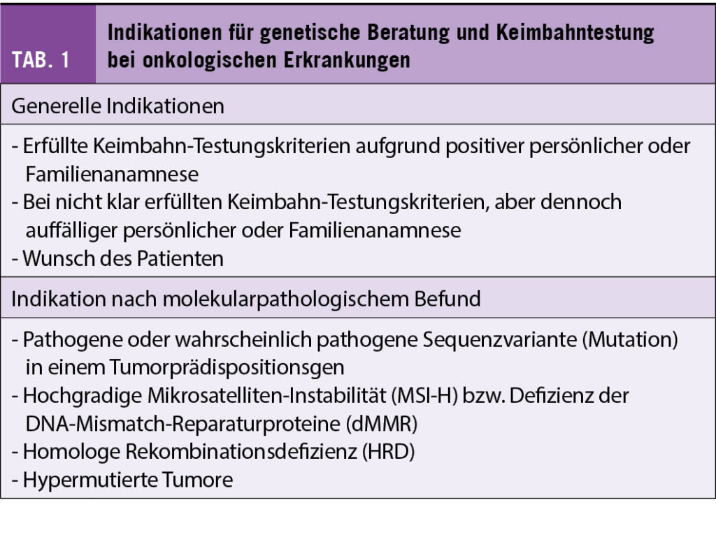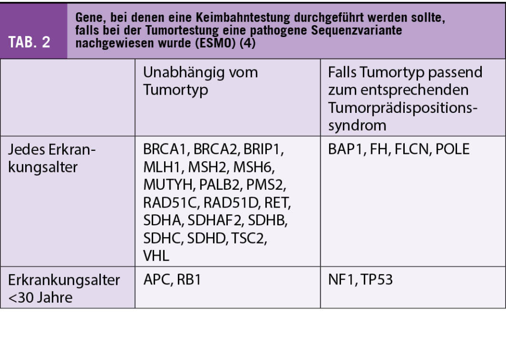 Eine genetische Beratung sollte durchgeführt werden, wenn im Tumorzellgenom eine pathogene Variante in einem Tumorprädispositionsgen vorliegt (1). Dies gilt besonders für Tumorprädispositionsgene, bei denen eine pathogene Keimbahnvariante mit einer hohen Tumorpenetranz assoziiert ist und/oder klinische Optionen zur Verminderung des Tumorerkrankungsrisikos bestehen (Früherkennung, chirurgische Massnahmen, etc.). Die Precision Medicine Working Group der Europäischen Gesellschaft für medizinische Onkologie (ESMO) hat eine Liste von 27 Genen veröffentlicht, bei denen der Nachweis einer pathogenen Sequenzvariante in der Tumortestung zu einer Keimbahntestung führen sollte (Tab. 2) (4).