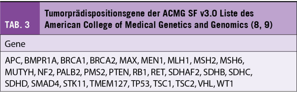 Als sekundäre (inzidentelle) Befunde gelten Ergebnisse, die ausserhalb der ursprünglichen Absicht bzw. Fragestellung einer Testung entdeckt werden (3). Verschiedene Fachgesellschaften haben Empfehlungen zum Umgang mit sekundären Keimbahnbefunden bei klinischen Exom- und Genomsequenzierungen veröffentlicht. Eine aktuelle Empfehlung des American College of Medical Genetics and Genomics (ACMG) enthält eine Liste von 73 Genen (ACMG SF v3.0), bei denen pathogene und wahrscheinlich pathogene Varianten auch dann berichtet werden sollten, wenn die Keimbahntestung mit einer anderen Fragestellung durchgeführt wurde (8, 9). Die ACMG Liste umfasst auch 28 Gene, die mit einer Tumorprädisposition assoziiert sind (Tab. 3). Bei Exom- und Genomsequenzierungen im Rahmen der molekularpathologischen Tumordiagnostik sind vor allem sekundäre Befunde von Bedeutung, die für Phänotypen ursächlich sind, die in keinem direkten Zusammenhang mit der onkologischen Erkrankung stehen. So nennt die ACMG Liste unter anderem Gene, die mit kardiovaskulären Erkrankungen, Stoffwechselstörungen und neurologischen Erkrankungen assoziiert sind.