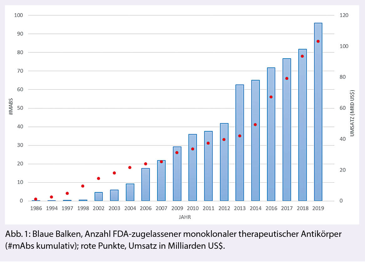 Die ursprünglichen therapeutischen mAbs wurden aus Maus- und Ratten-Hybridomen erstellt (–momab). 1986 wurde Muromomab-CD3 als erster mAb zur Behandlung akuter Abstossungsreaktionen nach allogener Nieren-, Herz- oder Lebertransplantation zugelassen. Aufgrund der kurzen Halbwertszeit und der ausgeprägten Immunogenität, fand die erste Generation limitierten Eingang in den klinischen Alltag. Durch moderne biotechnologische Verfahren konnte die mAb-Struktur humanisiert werden. Es entstanden zunächst chimäre (-ximab), später humanisierte (-zumab) und humane (-umab) Antikörper mit verbesserter Pharmakokinetik, Antigen-Spezifität und reduzierter Immunogenität. Infolgedessen wurden therapeutische Antikörper zur prädominanten Klasse neuentwickelter Arzneimittel und Bestsellern der Pharmaindustrie mit einem geschätzten jährlichen Umsatz von ca. 115 Milliarden US$ im Jahr 2019 und erwarteten 300 Milliarden US$ bis 2025(2, 3) (Abb. 1).