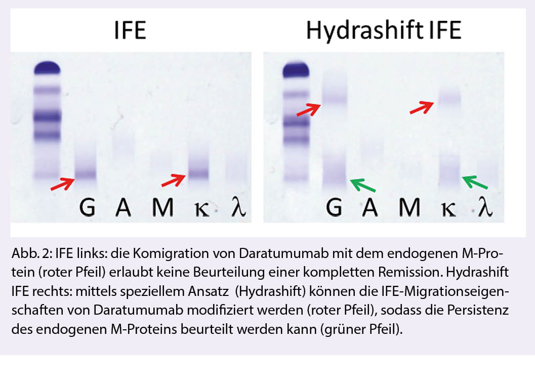 Seit 2016 sind Daratumumab (anti-CD38) und Elotuzumab (anti-SLAMF-7) sowie seit 2020 Isatuximab (anti-CD38) für die Behandlung des MM in der Schweiz zugelassen. Als neue Option wurde kürzlich Belantamab (anti-BCMA) Mafodotin zur Monotherapie bei rezidiviertem, refraktärem MM für die EU bestätigt – die Schweiz könnte nachziehen (6). Als humane monoklonale IgG-Kappa-Antikörper können diese mAbs sowohl mittels Serum-Protein Elektrophorese (SPE) als auch durch Immunfixations-Elektrophorese (IFE) nachgewiesen werden (Abb. 2). Beide Methoden werden routinemässig für das Screening (Gammopathie-Abklärung) und die Überwachung eines endogenen monoklonalen Proteins (M-Protein) angewendet (7). Diese Interferenz ist stark von der Pharmakokinetik der einzelnen mAbs abhängig. Bei Patienten mit einem endogenen IgG-Kappa-Myelomprotein unter Behandlung mit Daratumumab kann die Überwachung des Therapieansprechens erschwert und eine komplette Remission maskiert werden. Umgekehrt kann bei Myelom-Patienten in Remission ein Rezidiv oder sogar eine Progression der Erkrankung vorgetäuscht werden. Spezielle Analysenansätze erlauben heute die Unterscheidung zwischen endogenem und therapeutischem monoklonalen M-Protein bei Daratumumab-Behandlung (8). Ob ein solch aufwändiger Ansatz erforderlich ist, kann nur durch das durchführende Labor aufgrund der elektrophoretischen Migrationseigenschaften des endogenen M-Proteins beurteilt werden.