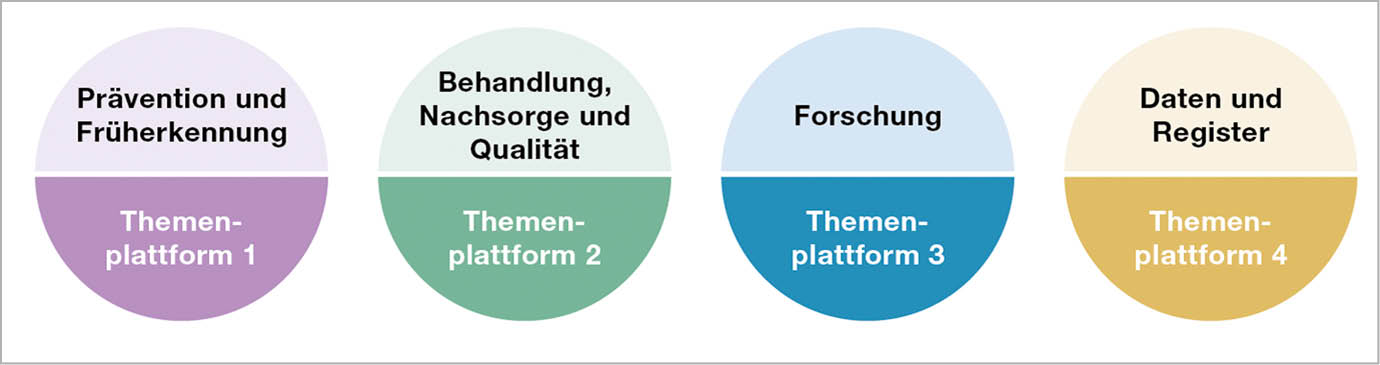 Im Nachgang zum Netzwerkanlass zur Themenplattform «Behandlung, Nachsorge und Qualität» publizierte Oncosuisse den resultierenden Bericht. Dieser nimmt Fragestellungen auf wie beispielsweise die Gewährleistung der Zugangsgerechtigkeit bei onkologischen Therapien, eine punktuelle Implementierung von Psychoonkologie und Palliativ Care entlang des Patientenpfades, die Stärkung der Patientenorientierung und die langfristige Sicherung von Kompetenzen und Qualifikationen in der Versorgungskette. Im Bereich der Nachsorge stellen Themen zum Umgang mit Cancer Survivorship, zur Entwicklung der Selbstkompetenz und Selbstwirksamkeit von an Krebs erkrankten Menschen und Lebensqualität den Schwerpunkt. Der Bereich der Qualität setzt ergänzend zur Qualitäts-Entwicklung und Qualitäts-Sicherung den Fokus auf die Stärkung des schweizerischen onkologischen Netzwerkes, den Wissenstransfer, sowie die Aus-, Weiter- und Fortbildung.