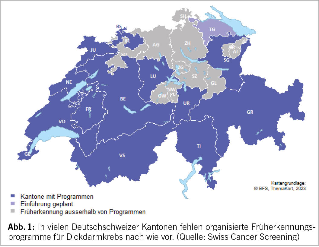 Zur Früherkennung von Dickdarmkrebs empfiehlt die Krebsliga alle zwei Jahre den Blut-im-Stuhl-Test (FIT) oder alle zehn Jahre die Darmspiegelung – idealerweise im Rahmen eines kantonalen Früherkennungsprogramms. Leider haben noch immer nicht alle Kantone in der Schweiz ein systematisches Darmkrebsscreening eingeführt und das trotz des belegten Nutzens solcher Programme. Doch die weissen Flecken auf der Karte füllen sich langsam: Im vergangenen Jahr sind Bern und Luzern hinzugekommen, anfangs Jahr Basel-Landschaft und im Kanton Thurgau ist die Einführung geplant. Für die Umsetzung sind in mehreren Kantonen die kantonalen oder regionalen Krebsligen zuständig.