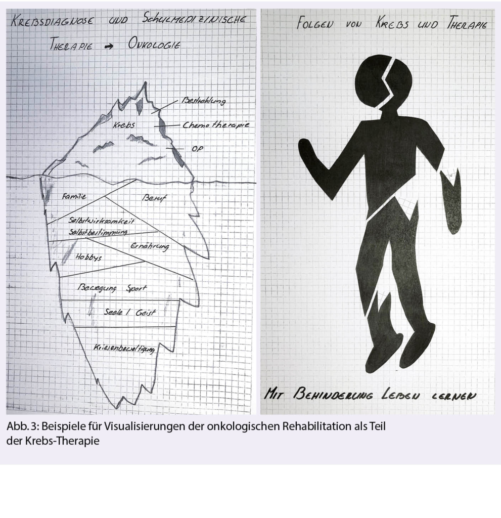 Bei krebsbetroffenen Menschen ist es eine zentrale Frage, welches das explizite Ziel der Reha-Intervention ist: orientiert (nur) am alten oder am neuen Leben? Im traditionellen Sinn bedeutet Rehabilitation (lat: rehabilitatio) Wieder-Herstellung, auch die WHO (f) verwendet den Begriff «wieder». Allerdings erlebt die grosse Mehrzahl von krebsbetroffenen Menschen eine neue eigene Realität: das Ziel ist nicht mehr «zurück ins gleiche Leben» wie vor der Krebsdiagnose, sondern «vorwärts in ein neues Leben». Die Orientierung am «alten Leben» bezüglich körperlicher, psychologischer, sozialer und intellektueller Funktion ist eine notwendige, aber nicht ausreichende Voraussetzung, da viele Menschen sog. innere Entwicklungen erfahren mit neu erkannten Prioritäten, Zielen und Lebenssinn. Eine Reha-Intervention sollte daher bei onkologischen Patientinnen und Patienten adäquate psychologische (11, 12), kreative (13, 14), existentielle (15) sowie körperbasierte (16) und Mind-Body- (17, 18) Reha-Interventionen beinhalten, dies ergänzend zu bewegungs-, physio-, ergo-, und ernährungstherapeutischen Interventionen.