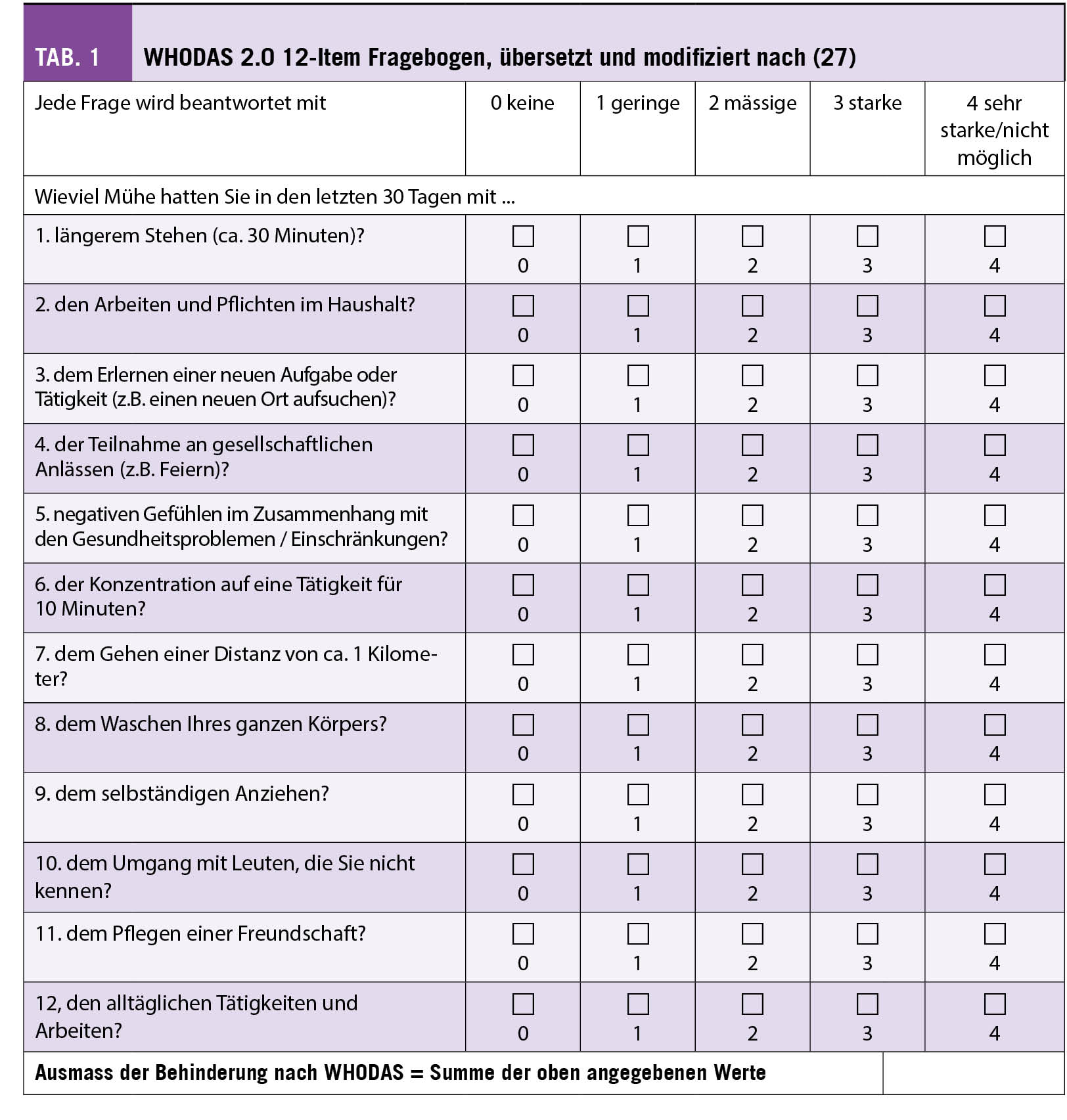 Fazit für den klinischen Alltag: Regelmässiges aktives Nachfragen nach subjektiv belastenden Einschränkungen in den 6 Bereichen Kognition, Mobilität, Selbstversorgung, soziale Interaktion, Lebensaktivitäten und gesellschaftliche Teilnahme. Alternativ kann der Distress-Thermometer eingesetzt werden um belastende Bereiche (ja/nein, 28 Themen) zu erkennen.