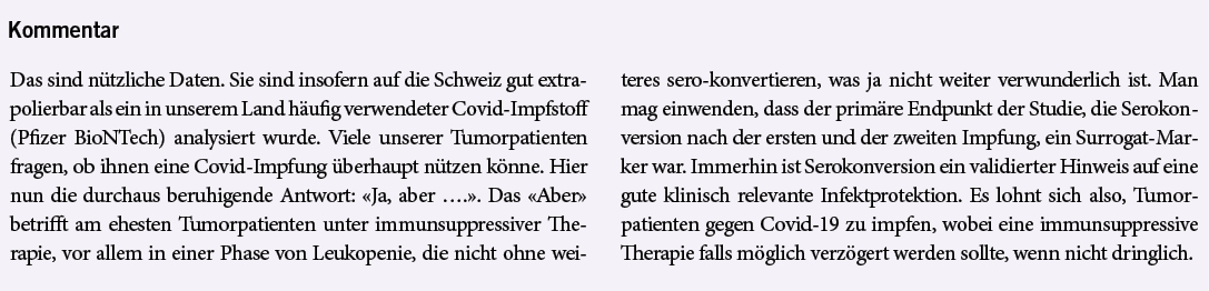 Zusammenfassung: The efficacy and safety profile of SARS-CoV-2 vaccines were acquired from phase 3 studies where patients with cancer were not represented.