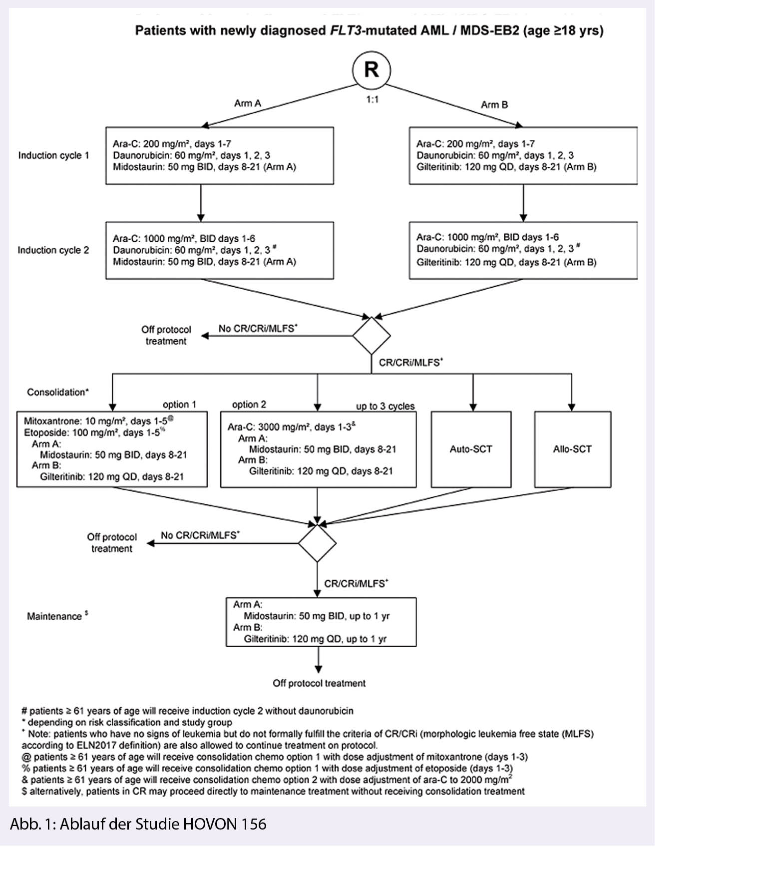 In der Studie HOVON 156 wird die Wirksamkeit von Gilteritinib und Midostaurin direkt verglichen. Patienten mit einer neu diagnostizierten AML und einer FLT3-Mutation, die sich einer intensiven Chemotherapie unterziehen, werden in zwei Gruppen randomisiert: Patienten der Gruppe A erhalten während Induktions-, Konsolidierungs- und Erhaltungstherapie zusätzlich Midostaurin, Patienten der Gruppe B zusätzlich Gilteritinib (Abb. 1). Insgesamt sollen 768 Patienten in die Studie eingeschlossen werden (384 Patienten pro Arm), davon ca. 50 Patienten in der Schweiz. Der primäre Endpunkt besteht im EFS, sekundäre Endpunkte sind unter anderem OS, Sicherheit, Verträglichkeit und Lebensqualität. Wir hoffen, dass die zusätzliche Gabe von Gilteritinib zur Chemotherapie dazu beiträgt, das Rezidivrisiko von AML-Patienten mit FLT3-Mutation zu senken und ihre Prognose zu verbessern.