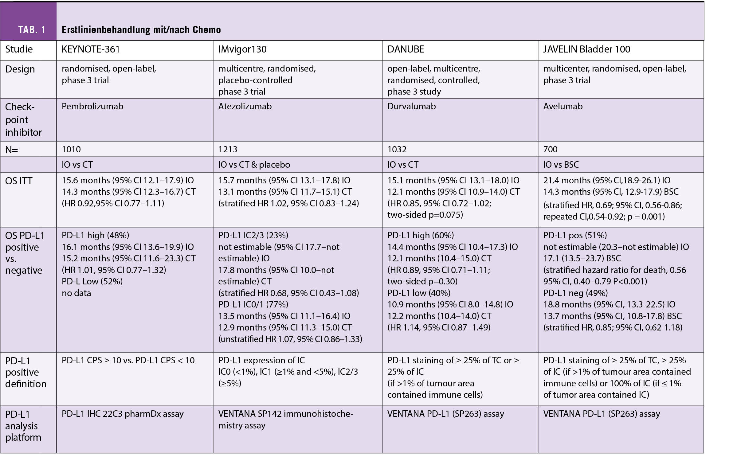 Beim Einsatz der Immuntherapie als Erstlinientherapie (als Monotherapie oder Kombination) im metastasierten Stadium zeigte sich kein signifikanter Vorteil im Hinblick auf das Gesamtüberleben (OS, overall survival) (KEYNOTE-361 [1], IMvigor130 [2], DANUBE [3]). Jedoch konnte die Erhaltungstherapie mit Avelumab einen signifikanten OS Benefit zeigen, wobei die Behandlung nach Ansprechen auf eine vorher durchgeführte Chemotherapie gegeben wurde (JAVELIN Bladder 100 [4]). Patienten mit hoher PD-L1 Expression zeigten sich hinsichtlich des Gesamtüberlebens identisch wie die entsprechende ITT (intention-to-treat) Gruppe. In keiner Studie wurde ein Unterschied zwischen Patienten mit unterschiedlicher PD-L1 Expression gefunden (fehlende Daten für die KEYNOTE 361 Studie) (Tab. 1).