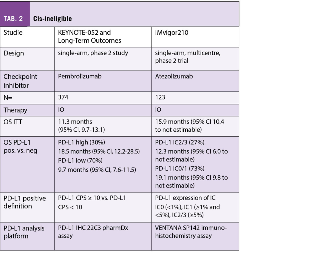 Anders stellt sich die Situation bei Patienten dar, die nicht für eine Therapie mit Cisplatin in Frage kommen: Zwei single-arm Studien zeigten widersprüchliche Resultate; PD-L1 positive Patienten, welche Pembrolizumab [5, 6] erhielten, zeigten ein längeres Überleben als PD-L1 negative Patienten, wohingegen in der Studie, in welcher Atezolizumab [7] verwendet wurde, kein Unterschied festgestellt wurde (Tab. 2).