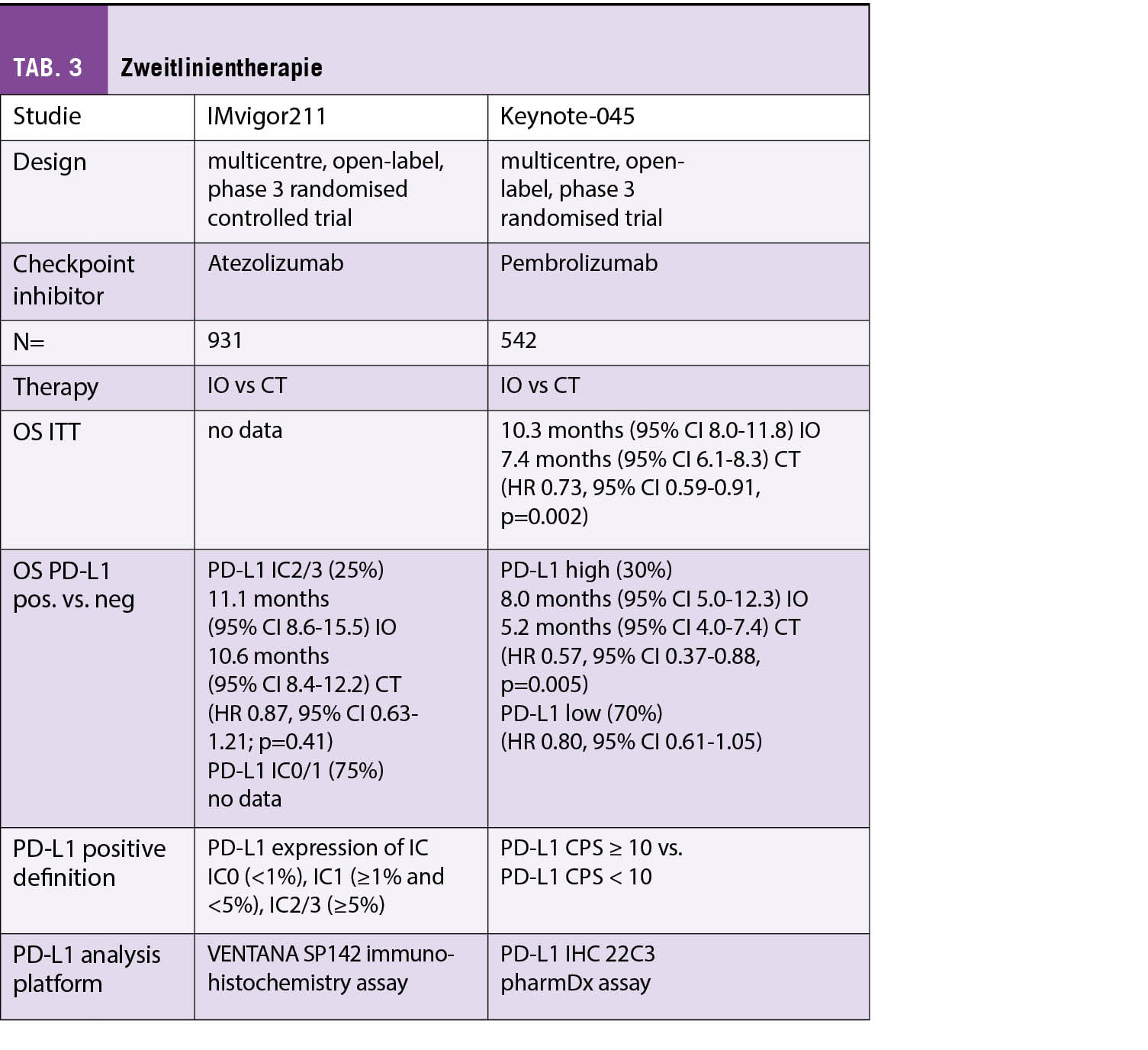 Beim fortgeschrittenen oder metastasierten Urothelkarzinom zeigte Atezolizumab keine Verbesserung hinsichtlich des Gesamtüberlebens für die Gruppe der PD-L1 positiven Patienten [8]. Demgegenüber profitierten Patienten von einer Zweitlinientherapie mit Pembrolizumab im Gesamtüberleben [9, 10]. Der PD-L1 Status spielte dabei jedoch keine Rolle (Tab. 3).