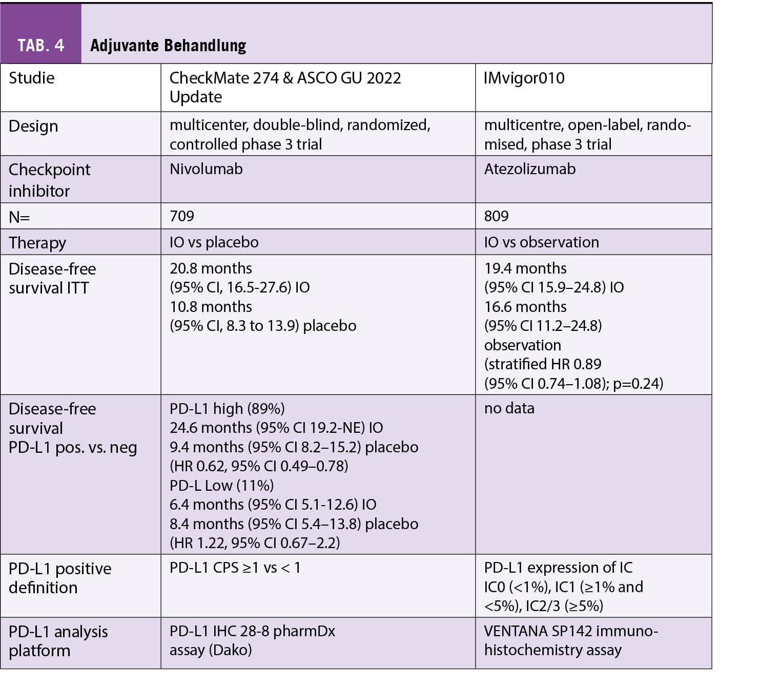 Für die untersuchten zwei Studien, welche Immuncheckpoint-Inhibitoren als adjuvante Therapie einsetzten (CheckMate 274 [11], IMvigor010 [12]), liegen keine Gesamtüberlebensdaten vor. Nivolumab zeigte gegenüber Placebo ein längeres krankheitsfreies Überleben in der ITT-Gruppe, der Effekt verstärkte sich in der PD-L1 positiven Patientengruppe. Beim Vergleich einer adjuvanten Behandlung mit Atezolizumab versus reiner Beobachtung konnte in keiner Gruppe ein Unterschied hinsichtlich des krankheitsfreien Überlebens festgestellt werden (Tab. 4).