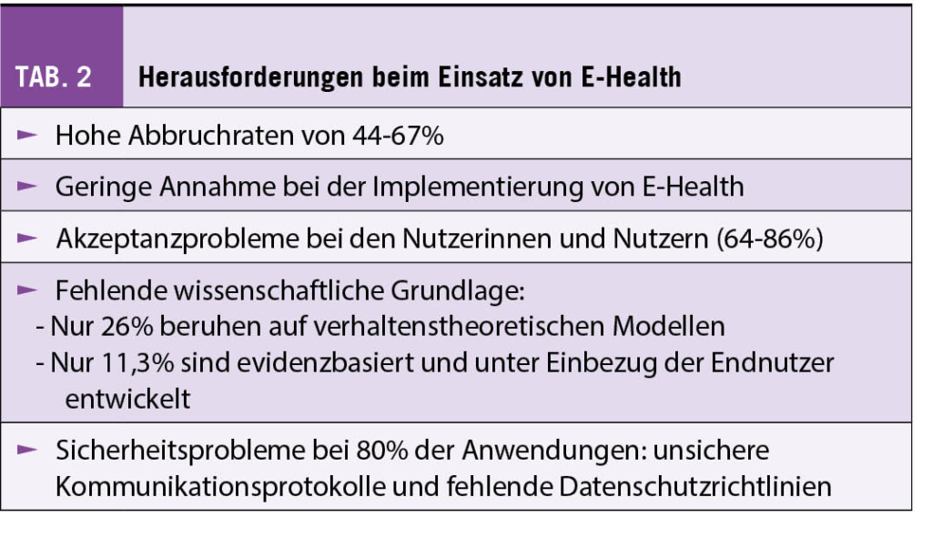Weitere Möglichkeiten der E-Health sind Telemedizin, also eine Konsultation per Videokonferenz, automatisierte Entscheidungsunterstützung durch Apps oder auch Peer Support, z.B. «Zauberbaum» für Kinder mit krebskranken Eltern oder «Mutperlen» für krebskranke Kinder und Jugendliche. Eine weit fortgeschrittene App aus Deutschland ist «Mika» (www.mitmika.de), die als erste solche App als Medizinprodukt verordnet werden kann. Mika wird für die digitale Therapiebegleitung für Patientinnen und Patienten mit Krebs eingesetzt. «E-Health bietet viele Möglichkeiten, es gibt aber auch eine Kehrseite der Medaille», gab Dr. Valenta zu bedenken (Tab. 2). Problematisch ist vor allem, dass die wenigsten Produkte evidenzbasiert sind.