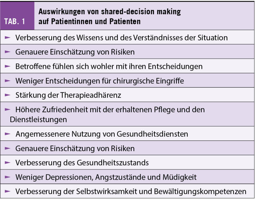 Dr. Sylvie Rochat, Patientin aus Neuchâtel, plädierte für eine verbesserte Zusammenarbeit von Patientinnen, Patienten und Fachpersonal. Das Ziel dabei ist, dass Patientinnen und Patienten freie und informierte Entscheidungen treffen können, dass sie Mitglied des Pflegeteams sind und dass ihr Erfahrungswissen anerkannt und mobilisiert wird. Allerdings bestehen auf Seiten des Gesundheitspersonals oft viele Widerstände gegen den partnerschaftlichen Ansatz. «Für wenig gebildete Patienten ist das nicht geeignet», «Dafür haben wir keine Zeit», «Das ist nicht effizient» oder «Das wird dazu führen, dass die Patienten ungeeignete Behandlungen fordern» sind nur einige der Gegenargumente. Eine partnerschaftliche Pflege hat aber viele positive Auswirkungen auf die Patientinnen und Patienten (Tab. 1). Informierte Patienten verfügen ausserdem über Ressourcen, die auch für die Verbesserung des Gesundheitssystems genutzt werden können – zum Beispiel, wenn Betroffene ihr Wissen und ihre Erfahrungen an andere Betroffene weitergeben und ihnen damit eine höhere Lebensqualität ermöglichen. Weiterhin können sich Patientinnen und Patienten an der Ausbildung von Studierenden der Gesundheitsberufe beteiligen oder als Co-Forschende das Wissen im Bereich Gesundheit vergrössern.