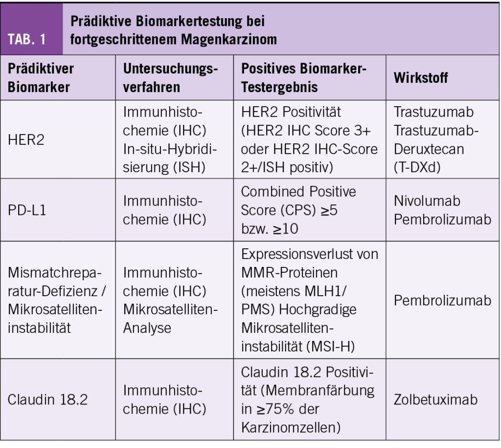 Bei Magenkarzinomen im lokal fortgeschrittenen, nicht resezierbaren oder metastasierten Stadium ist eine medikamentöse Systemtherapie mit palliativer Zielsetzung indiziert (4). Als Erstlinienbehandlung wird eine Platin-/Fluoropyrimidin-haltige Kombinationstherapie eingesetzt. Diese kann durch zielgerichtete und/oder immunonkologische Therapien ergänzt werden, falls prädiktive Biomarkertestungen positiv ausfallen. Aktuelle Guidelines von Fachgesellschaften (ESMO, NCCN, ASCO) empfehlen bei Magenkarzinom die Testung der Biomarker HER2, PD-L1 und Mismatchreparatur-Defizienz (4-6) (Tabelle 1). Aktuelle Studienergebnisse lassen erwarten, dass diese Liste zukünftig durch Claudin 18.2 (CLDN18.2) ergänzt wird.