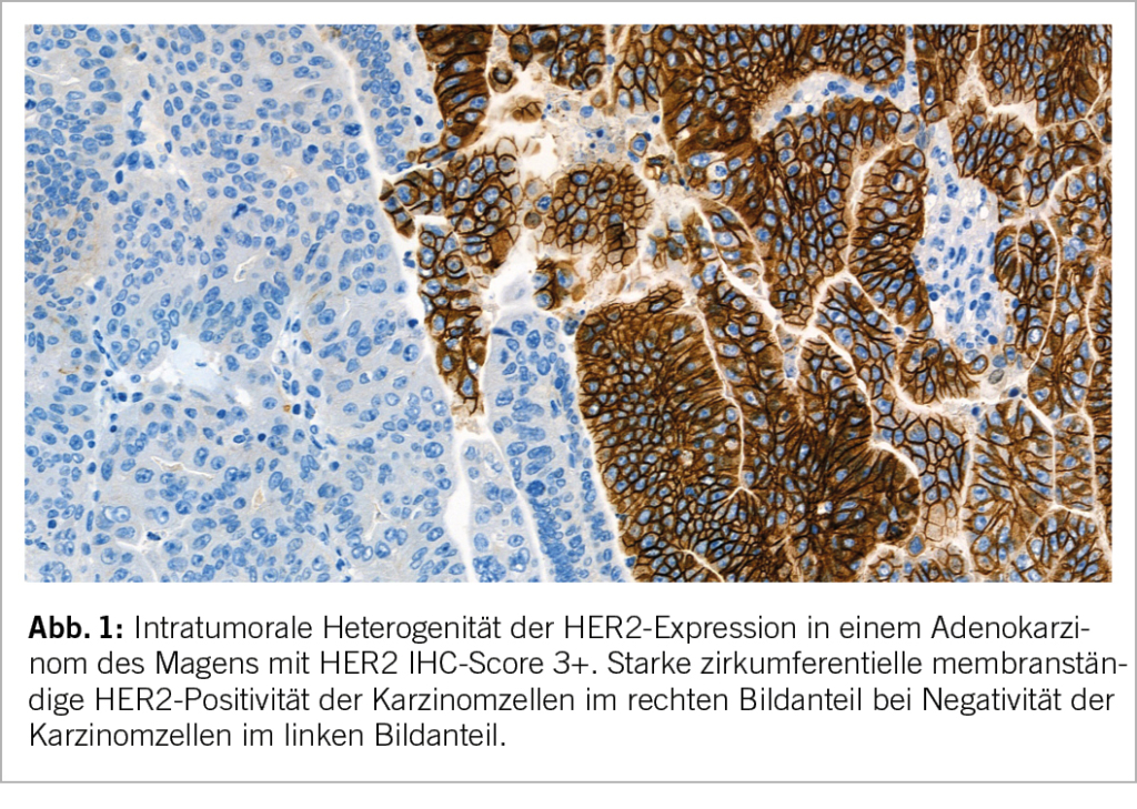 Eine ASCO/CAP Guideline beschreibt einen Algorithmus und Beurteilungskriterien für die HER2-Testung bei Magenkarzinom (8). HER2-positive Karzinome sind charakterisiert durch eine Überexpression des HER2-Proteins oder eine HER2-Genamplifikation. Die HER2-Proteinexpression wird mittels Immunhistochemie (IHC) untersucht und das Färbeergebnis einer von vier semiquantitativen Kategorien zugeordnet (HER2 IHC-Score 0, 1+, 2+, oder 3+). Der HER2 IHC-Score wird anhand der Intensität der membranständigen HER2-Immunreaktivität und der Anzahl der positiven Karzinomzellen ermittelt. Ein HER2 IHC-Score 3+ in ≥ 10% der Tumorzellen gilt als positiv für eine HER2-Überexpression (Abb.1). Zum Nachweis einer HER2-Genamplifikation wird die In-situ-Hybridisierung (ISH) eingesetzt, bei der die Anzahl der HER2-Genkopien in den Tumorzellen bestimmt und in Beziehung zur Chromosom 17-Zahl (CEP17) gesetzt wird. Eine HER2/CEP17 Ratio ≥2 wird als positiv für eine HER2-Genamplifikation bewertet. Häufig findet sich eine intratumorale Heterogenität des HER2-Status der Magenkarzinomzellen, so dass der endoskopischen Entnahme von repräsentativem Probenmaterial für die histopathologische Diagnostik grosse Bedeutung zukommt. Es wird die Entnahme bzw. Analyse von mindestens fünf, besser sechs bis acht Biopsieproben mit Karzinomzellen empfohlen (8).