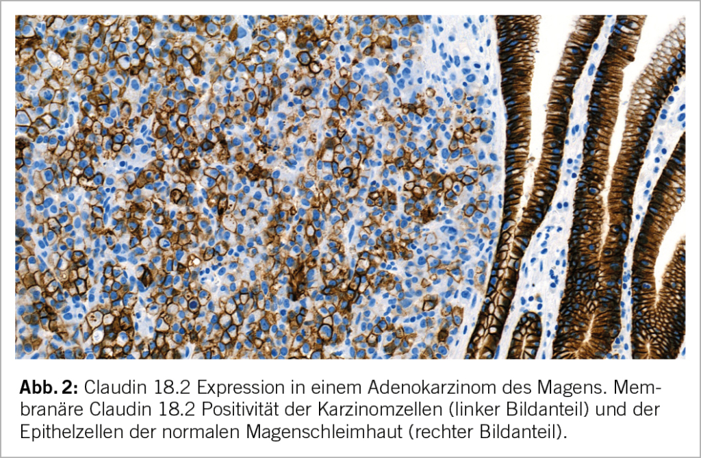 Claudin 18.2 (CLDN18.2) wird in den Schlussleisten der normalen Magenschleimhaut exprimiert und ist dort an der Regulation von Epithelzellpolarität und Schleimhautpermeabilität beteiligt. Bei einem Teil der Magenkarzinome findet sich CLDN18.2 auf der Oberfläche der Karzinomzellen (Abb. 2).