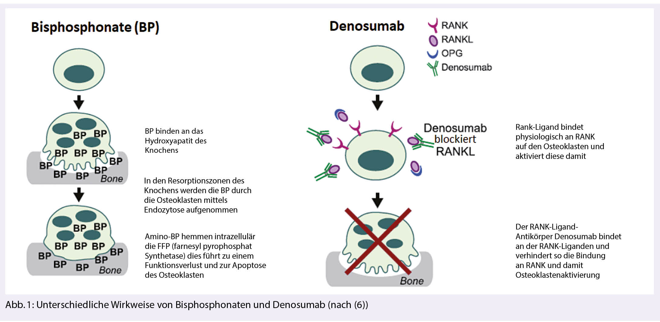Der RANK-Ligand-Antikörper Denosumab (XGEVA®) bindet an den RANK-Liganden und verhindert damit die Aktivierung des Osteoklasten, indem die Bindung des RANK-Liganden an RANK auf der Osteoklastenoberfläche verhindert wird (Abb. 1). Denosumab imitiert damit die endogene Wirkung des Osteoprotegerin (6). Der RANK-Ligand Antikörper ist bisher nur bei ossären Metastasen solider Tumore in Kombination mit einer antineoplastischen Therapie zugelassen und kassenpflichtig.