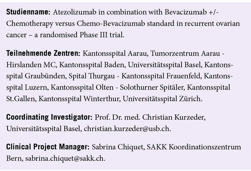 In der Studie AGO-OVAR wird untersucht, ob die Zugabe von Atezolizumab zur Standardtherapie mit Bevacizumab und Chemotherapie bei Patientinnen mit einem rezidivierten, platinresistenten Ovarialkarzinom einen Überlebensvorteil bringt. Verschiedene Studien weisen darauf hin, dass die Kombination eines Angiogenese-Inhibitors (Bevacizumab) und eines Immuntherapeutikums (Atezolizumab) in der Tumortherapie einen klinischen Nutzen bei akzeptabler Verträglichkeit haben könnte. Aus diesem Grund wird diese Kombination nun in AGO-OVAR geprüft. An der Studie werden rund 200 Zentren weltweit teilnehmen (darunter 11 Zentren in der Schweiz), mit dem Ziel, 664 Patientinnen einzuschliessen (43 Patientinnen sind für die Schweiz vorgesehen).