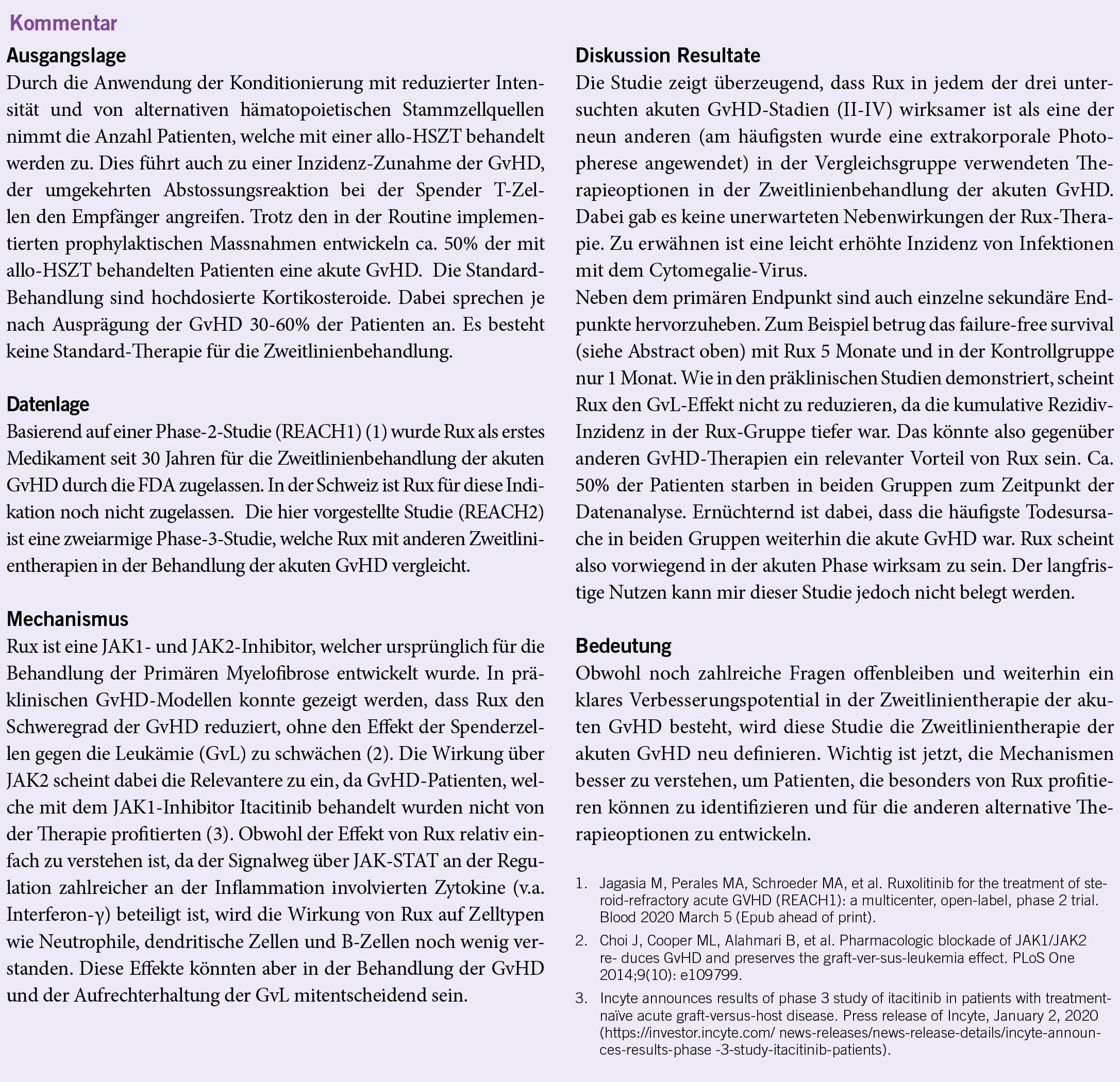 Die akute Graft-versus-Host-Krankheit (GVHD) stellt nach wie vor eine wesentliche Komplikation der allogenen hämatopoietischen Stammzelltransplantation (allo-HSZT) dar; nicht alle Patienten sprechen auf die Standardbehandlung mit Glukokortikoiden an. In einer Phase 2-Studie (REACH1) zeigte Ruxolitinib (Rux), ein selektiver Januskinase-Inhibitor (JAK1 und JAK2), potenzielle Wirksamkeit bei Patienten mit glukokortikoid-refraktärer akuter GVHD.