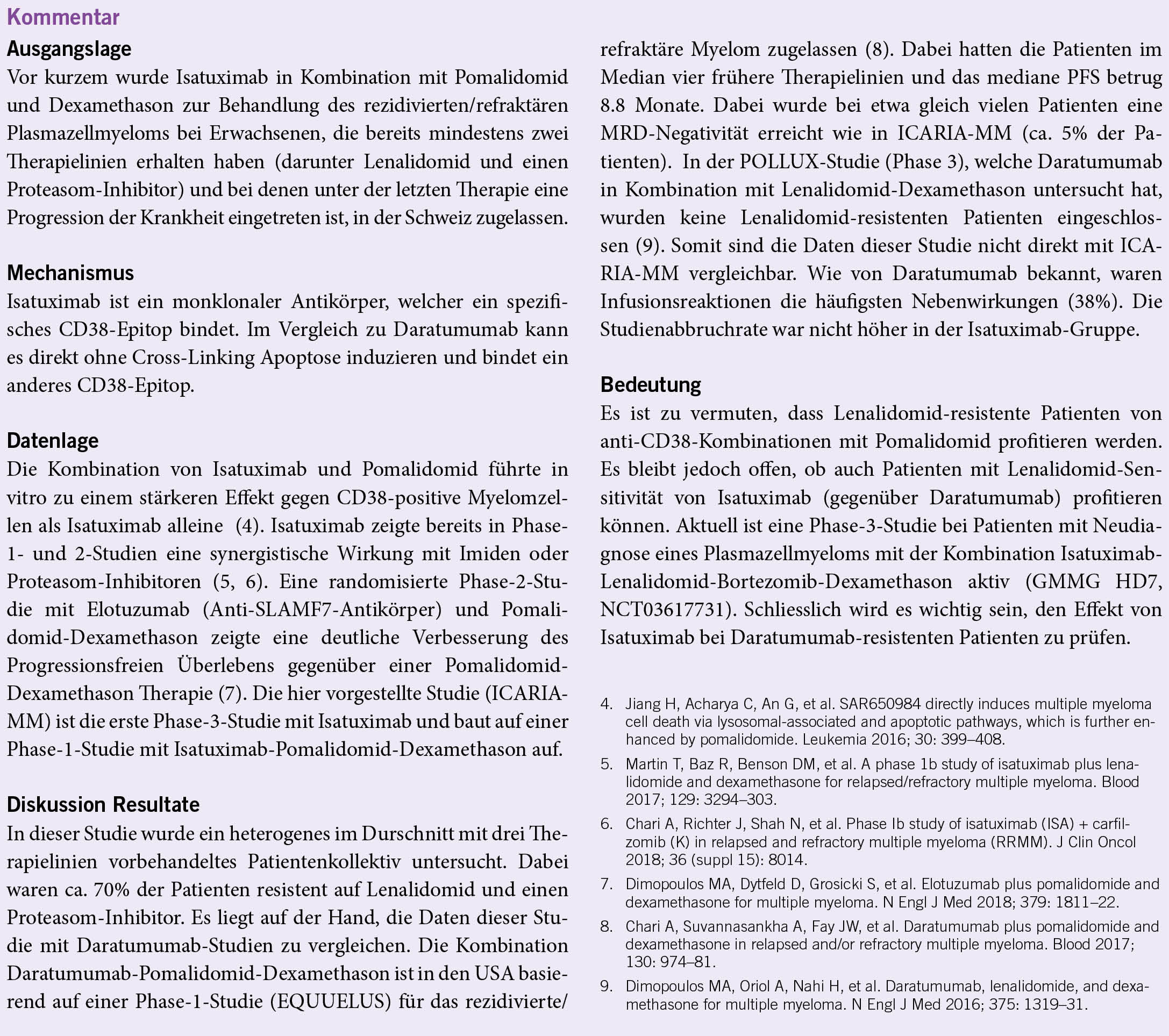 Die Zugabe von Isatuximab zu Pomalidomid-Dexamethason verbessert das progressionsfreie Überleben bei Patienten mit rezidiviertem und refraktärem Multiplem Myelom. Isatuximab ist eine wichtige neue Option für die Behandlung des rezidivierten und refraktären Myeloms, insbesondere für Patienten, die refraktär auf Lenalidomid und einen Proteasom-Inhibitor sind.