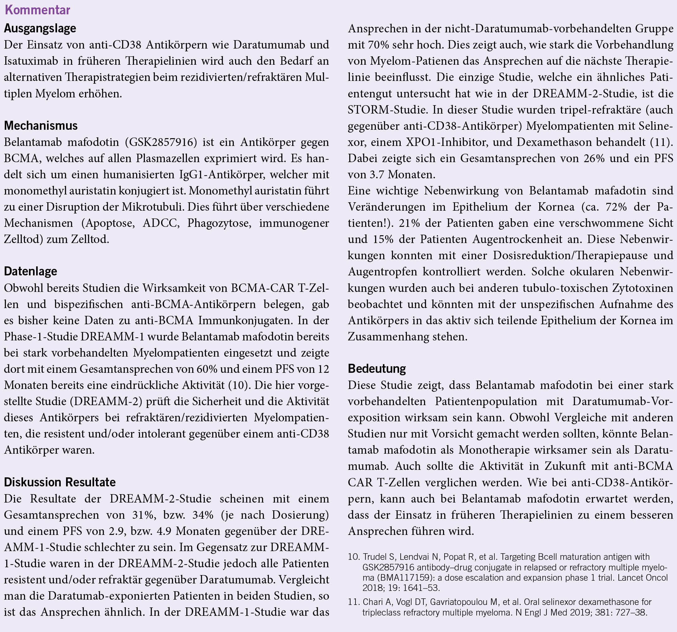 Belantamab mafodotin (GSK2857916), ein Immunkonjugat, das gegen das B-Zell-Maturations-Antigen (BCMA) gerichtet ist, zeigte Monotherapieaktivität in der Phase-1-Studie DREAMM-1 bei stark vorbehandelten Patienten mit rezidiviertem oder refraktärem Multiplem Myelom. In der DREAMM-2-Studie wurde die Sicherheit und die Aktivität von Belantamab mafodotin weiter untersucht.
