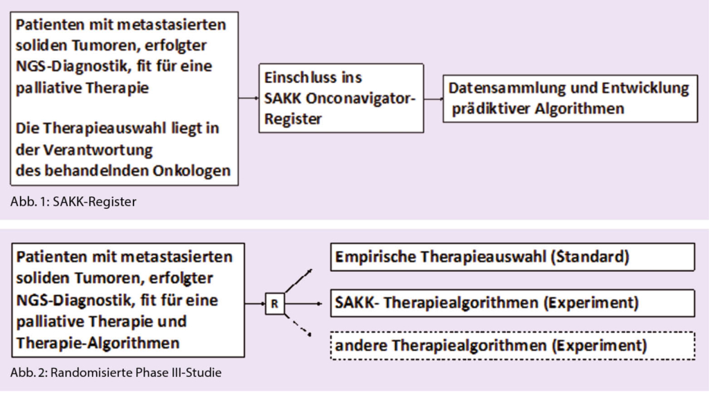 Das SAKK-Projekt Onconavigator zielt darauf hin, die personalisierte Onkologie in der Schweiz in einem breiten Kontext voranzubringen. Es umfasst ein nationales Register (Abb. 1) von Patienten mit fortgeschrittenen soliden Tumorerkrankungen aller Art. Für den Einschluss wird eine NGS-Tumoranalyse vorausgesetzt. Diese kann lokal durchgeführt werden und sollte zumindest ein Standardpanel umfassen. Die Therapieentscheidung liegt ausschliesslich in der Verantwortung des Onkologen und seines Patienten. Der behandelnde Onkologe kann, falls in der NGS-Untersuchung eine behandelbare Veränderung gefunden wurde, eine zielgerichtete Therapie, oder eine konventionelle Therapie seinem Patienten empfehlen. Unterstützung erhält er bedarfsweise durch ein molekulares Tumorboard, welches auf Anfrage Empfehlungen für eine personalisierte Therapie basierend auf der genomischen Testung erarbeitet. Im Register werden alle medikamentösen Therapien erfasst, d.h. alle zielgerichteten, als auch alle nicht zielgerichteten Therapien und damit alle Formen von Chemotherapien.