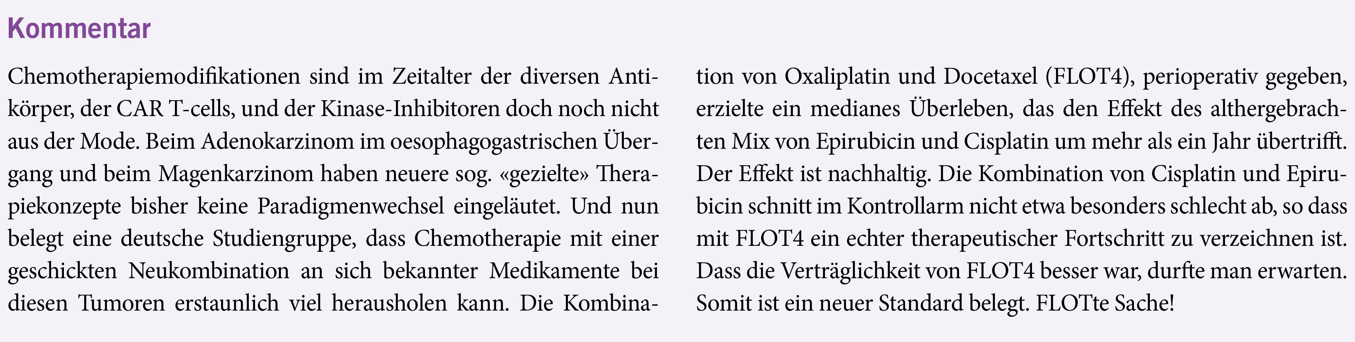 Zusammenfassung: Prä- und postoperative Therapie mit FLOT (d.h. einer Chemotherapie mit Oxaliplatin und einem Taxan) ergibt bei resektablem Adenokarzinom im oesophagogastrischen Übergang oder im Magen deutlich längeres Überleben (median 50 Monate) als ein Cisplatin-/Epirubicinhaltiges Regime (median 35 Monate).