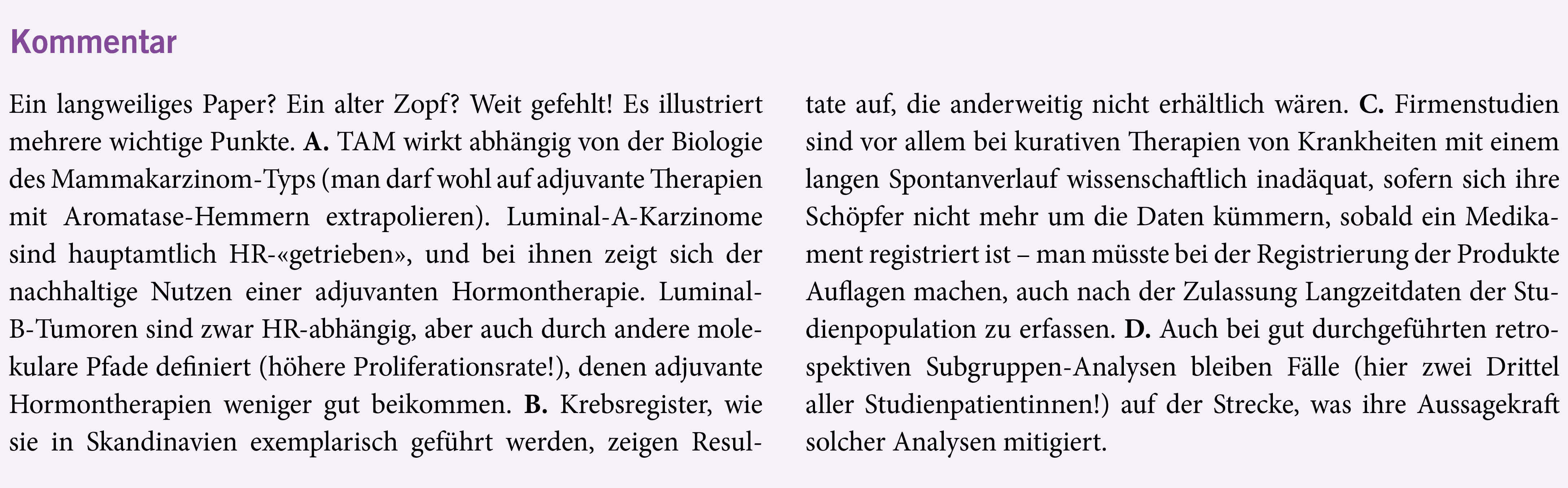 Zusammenfassung: Frauen mit ER-POS Mammakarzinom profitieren von der adjuvanten Therapie mit Tamoxifen (TAM); ein Restrisiko für Rezidive kann allerdings lange im Verlauf bestehen bleiben, je nach Karzinomtyp. Im Lichte der modernen Diagnostik wäre es nun sinnvoll, Mammakarzinom Typ Luminal A versus B getrennt zu diskutieren. Studien mit «alten» Daten und Langzeitresultaten stammen aber aus der Zeit, als man die Luminaltypen noch nicht kannte. Die schwedische Studie STO-3 randomisierte in den Jahren 1976-1990 total 1846 postmenopausale Patientinnen mit Mammakarzinom in einen Arm mit Tamoxifen (40 mg während 2 Jahren) versus Placebo (was man damals ethisch noch vertreten konnte). Ab dem Jahr 1983 wurden Frauen, die in den ersten zwei Studienjahren noch kein Rezidiv erlebt hatten, randomisiert für drei weitere Jahre TAM versus Placebo. Da das Schwedische Brustkrebsregister praktisch alle Fälle von Mammakarzinom im Land umfasst, konnten fast alle Studienpatientinnen ab 2012 für Langzeitresultate abgerufen werden. Bei 808 Patientinnen (d.h. knapp der Hälfte) war paraffin-fixiertes Tumormaterial vorhanden, und bei 652 (einem Drittel) der Fälle konnten die modernen diagnostischen Methoden angewandt werden, um Luminal-A- von Luminal-B-Karzinomen zu unterscheiden. Die Fälle verteilten sich – le hasard fit bien les choses – etwa zu gleichen Teilen auf die beiden Studienarme. Luminal-A-Karzinome zeigten einen Langzeitnutzen von TAM. Sie sind genau die Mammakarzinome, die noch nach 20-25 Jahren Rezidive aufweisen können. Der Nutzen der adjuvanten Therapie bei Luminal-B-Karzinomen hingegen fand sich vor allem in den ersten 5 Jahren, was eher durch die andere Biologie dieser Tumoren als durch die Therapie bedingt ist. Das rezidivfreie Überleben von unbehandelten Patientinnen mit Luminal-A-Karzinom war länger als das der Frauen mit Luminal-B-Karzinom unter TAM!