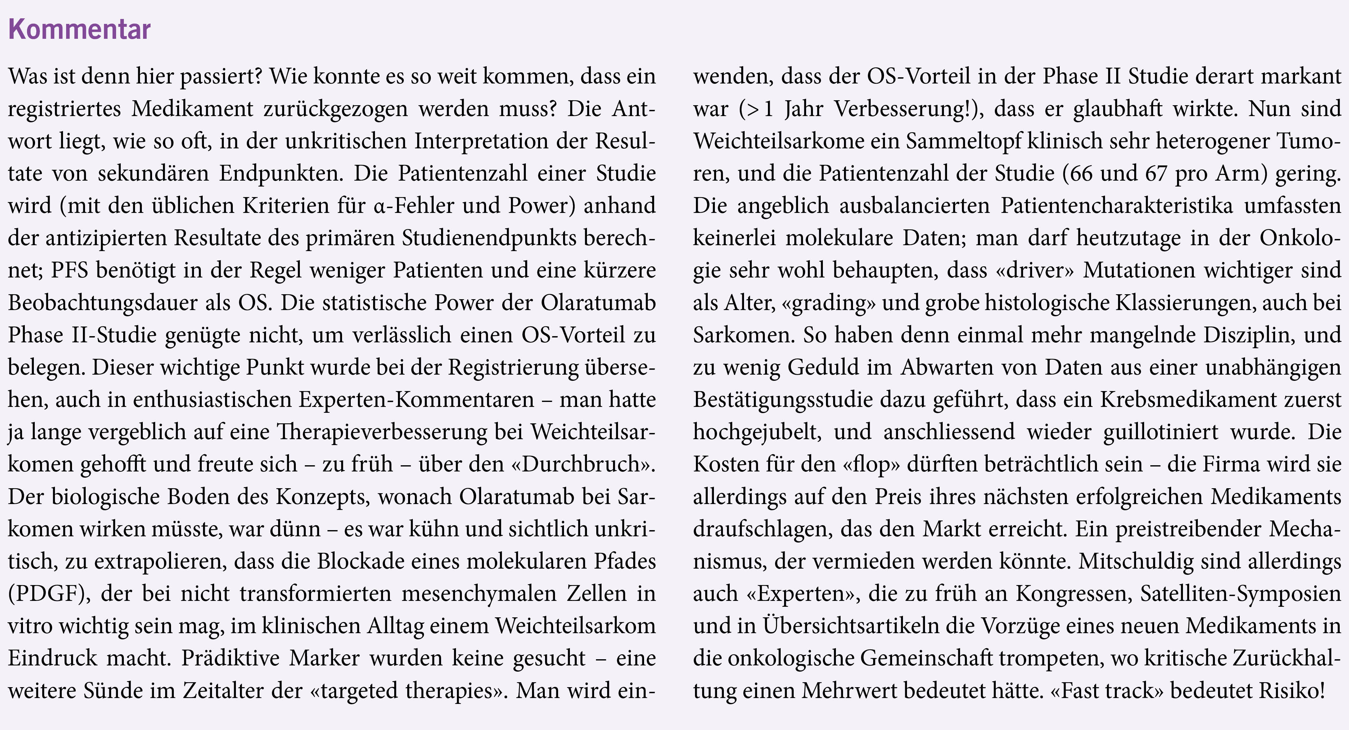 Zusammenfassung: Plateletderived growth factor (PDGF) und sein Rezeptor (PDGFR) spielen in der Biologie der mesenchymalen Zellen eine Rolle. Die Studiengruppe testete deshalb einen anti-PDGF und anti-PDGFR-Antikörper, Olaratumab, als Therapeutikum in Kombination mit Doxorubicin für inoperable Weichteilsarkome. Progressionfree survival (PFS – der primäre Endpunkt der Phase II-Studie) war 6.6 Monate in der Kombination und 4.1 Monate für Doxorubicin alleine (HR 0.67, 95% CI 0.44-1.02). Medianes Überleben (OS – geplant als sekundärer Endpunkt) war 26.5 Monate dank der Kombination versus 14.7 Monate mit Doxorubicin alleine. Demnach hebelte der Antikörper eine Verbesserung des Gesamtüberlebens um fast ein Jahr heraus. Er wurde demzufolge im Herbst 2017 als Medikament registriert, auch in der Schweiz unter dem Markennamen Lartruvo®. Das ESMO Guidelines Committee publizierte eilends einen «alert» Artikel mit dem Kommentar «The observed PFS benefit is associated with an ESMO Magnitude of Clinical Benefit Scale (ESMO-MCBS) score of 4, because of the magnitude of improvement on OS.» Eine Phase III-Studie (ANNOUNCE ClinicalTrials.gov Identifier NCT02451943) mit OS als primärem Endpunkt war im Hintergrund am Laufen.