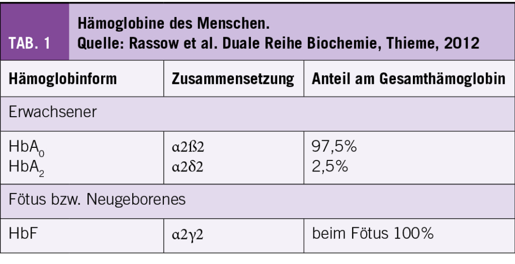 In gesunden Individuen, setzen sich die Hb-Ketten aus HbA (α2ß2) zu 96-97%, HbA2 (α2δ2) zu 2-3,5% und HbF (α2γ2) <1% zusammen (Tab. 1). Bei der SCD wird das HbA komplett oder teilweise durch das HbS ersetzt.