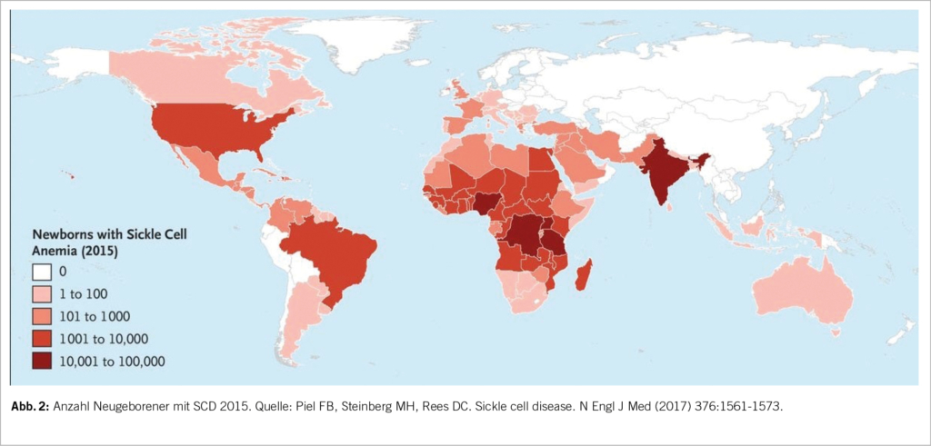 Die SCD ist hauptsächlich in Malariagebieten verbreitet, insbesondere in den tropischen Anteilen Afrikas, aber auch in Indien und in der arabischen Halbinsel (Abb. 2). Vermutlich stellt die SCD mit Ausnahme des HbSS-Phänotyps einen Selektionsvorteil gegenüber schweren Verläufen der Malaria dar (4). Durch Migration leben immer mehr Patienten mit SCD auch in Nord- und Südamerika sowie in Europa. Es wird geschätzt, dass in der Schweiz etwa 400-600 Menschen an SCD leiden. Die Dunkelziffer könnte dennoch höher sein, da es kein systematisches Screening oder Register gibt (6).