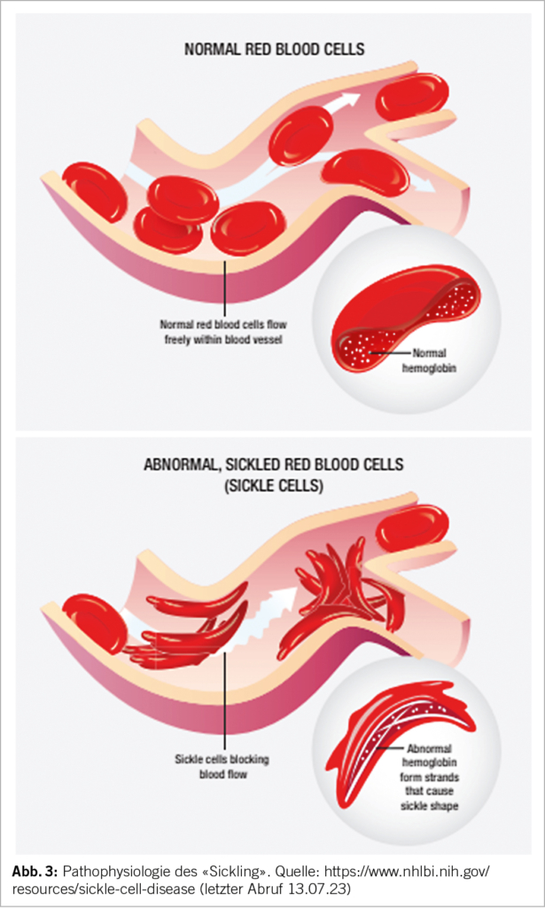 Bei Sauerstoffmangel formt das abnorme HbS Polymere, welche mit der Erythrozytenmembran interagieren und zu einer sichelzellförmigen Deformation des Erythrozyten führen (Abb. 3). Durch die Deformierung («Sickling») entsteht eine Vasookklusion insbesondere in der Mikrozirkulation. Mit rezidivierenden vasookklusiven Krisen kommt es zu einem Endothelschaden der Gefässe und zu wiederholten lokalen Ischämien. Die Lebenszeit der Erythrozyten nimmt aufgrund des mechanischen Schadens ab, eine chronische Hämolyse ist die Folge. Durch die Hämolyse und das konsekutiv freie Hb entstehen Sauerstoffradikale. Die Kaskade führt zu einem prothrombotischen und inflammatorischen Zustand. Die Ischämie und Hämolyse führen zu einem Multiorganschaden (5, 7).
