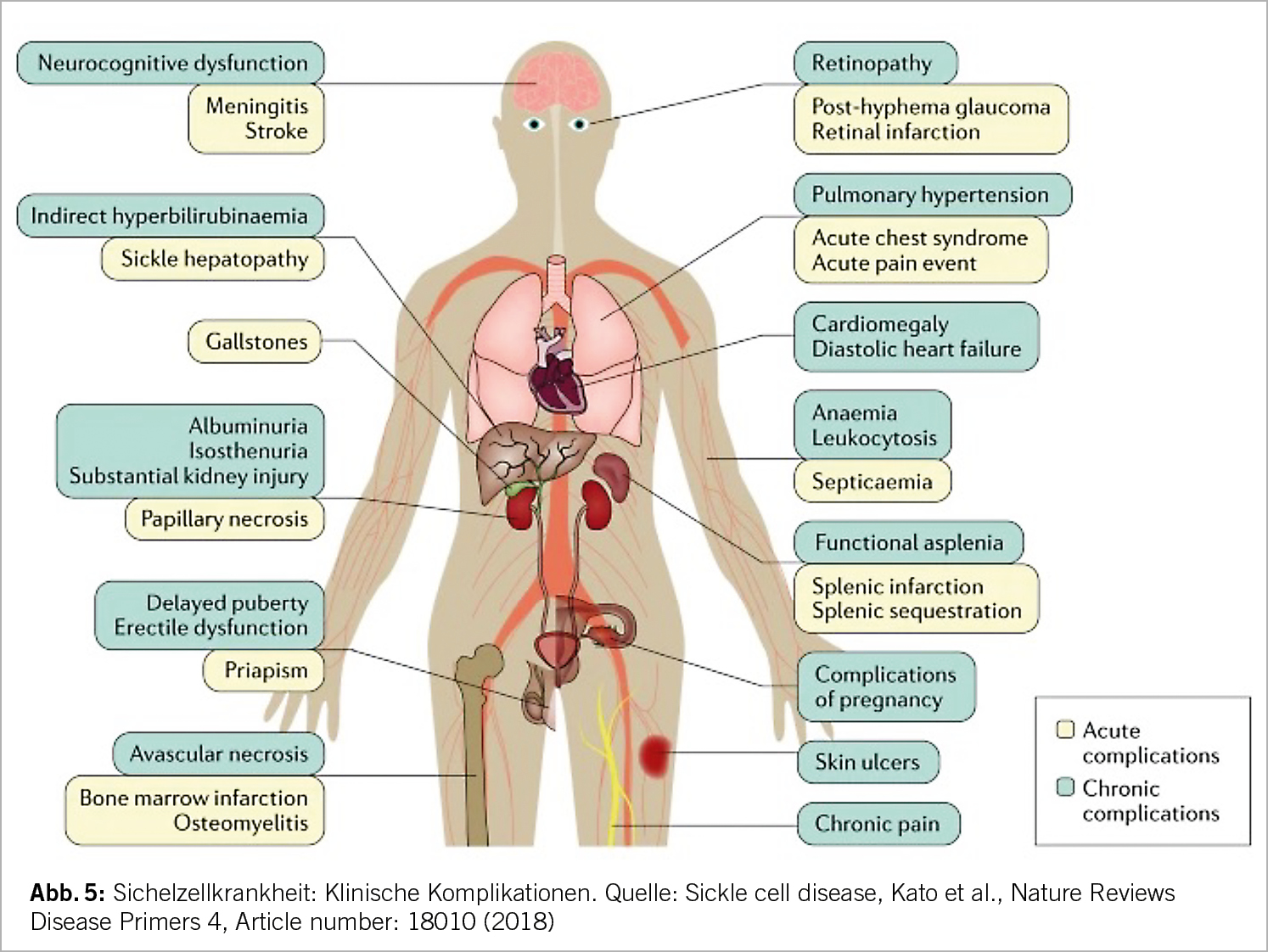 Aufgrund der komplexen Pathophysiologie kommt es zu einer Vielzahl von akuten und chronischen Komplikationen (Abb. 5). Zu den klassischen klinischen Erscheinungen gehören die vasookklusiven Schmerzkrisen, häufig mit Osteonekrosen assoziiert, die chronische hämolytische Anämie, Infektionen aufgrund der funktionellen Asplenie und das akute Thoraxsyndrom. Weitere chronische Organschäden können sich asymptomatisch im Laufe der Jahre entwickeln (z.B. Nephropathie, Herzinsuffizienz, pulmonal arterielle Hypertension).