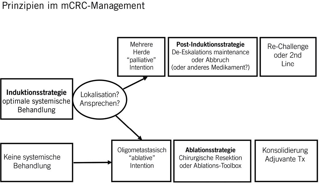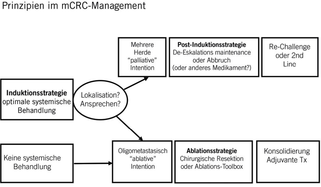 - Bei oligometastatischem Kolonkarzinom, «ablative» Intention: Ablationsstrategie: chirurgische Resektion oder «ablation toolbox»).