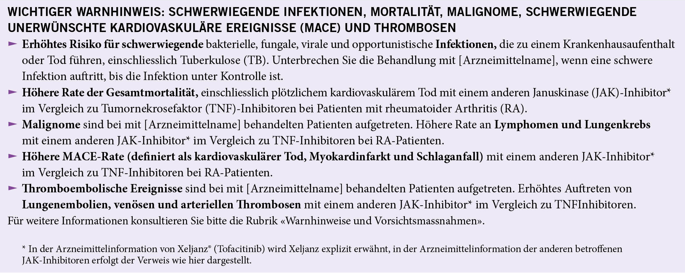 In einer grossen, randomisierten Sicherheitsstudie nach Markteinführung mit Xeljanz® (Tofacitinib), einem JAK-Inhibitor, bei RA-Patienten 50 Jahre und älter mit mindestens einem kardiovaskulären Risikofaktor wurde bei Patienten, die mit diesem JAK-Inhibitor behandelt wurden, im Vergleich zu mit Tumornekrosefaktor (TNF)-Inhibitoren behandelten Patienten, Folgendes beobachtet: