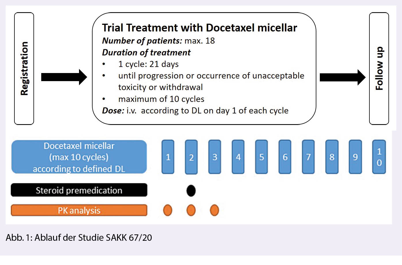 Der primäre Endpunkt von SAKK 67/20 ist die dosislimitierende Toxizität. Zu den sekundären Endpunkten gehören unter anderem das radiologische progressionsfreie Überleben, die Dauer bis zur PSA-Progression resp. PSA-Response und die Dauer der Response. An der Studie können maximal 18 Patienten mit mCRPC teilnehmen, bei denen noch keine Chemotherapie durchgeführt wurde. Die ersten drei Patienten (Patientenkohorte) erhalten im ersten Zyklus (21 Tage) 75 mg/m2 Docetaxel micellar, was der Standarddosis von Docetaxel bei der Therapie des mCRPC entspricht. Ist diese Dosis mit starken Nebenwirkungen verbunden, wird die Behandlung mit dieser Dosisstärke abgebrochen, und die nachfolgende Patientenkohorte erhält eine Dosis von 60 mg/m2. Verursacht die Behandlung mit 75 mg/m2 aber keine starken Nebenwirkungen, wird die nachfolgende Patientenkohorte mit 90 mg/m2 behandelt. Dieses Vorgehen wird so lange wiederholt, bis die höchstmögliche, noch gut verträgliche Dosis gefunden wird (maximal 100 mg/m2). Die Behandlung wird bis zur Krankheitsprogression resp. für maximal zehn Zyklen durchgeführt (Abb. 1).