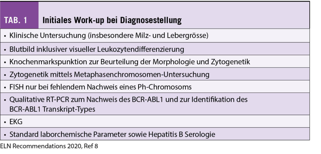 Über 50% der Patienten mit der Diagnose CML werden heute zufällig entdeckt. Symptome bei CML sind eher unspezifisch wie vermehrte Müdigkeit, Gewichtsverlust, nächtliches Schwitzen sowie bei Milzvergrösserung Völlegefühl und abdominelle Beschwerden. Ein Verdacht auf eine CML muss aufkommen, wenn sich im Blutbild eine Leukozytose mit zahlreichen myeloiden Vorstufen, eine milde Anämie und meist eine Thrombozytose zeigen. Sehr typisch ist eine Basophilie und z.T. eine Eosinophilie. Die Funktion der hämatopoietischen Zellen ist in der Regel erhalten, weshalb Patienten mit CML in einer chronischen Phase (CP) nicht ein höheres Infektions- oder Blutungsrisiko aufweisen. Zur Prognosestellung (siehe nächster Abschnitt), ist es relevant, die Blutwerte und die Grösse der Milz (in cm unter dem untersten Rippenbogen) vor Beginn der Therapie zu erfassen. Die Diagnosestellung einer CML kann mittels qualitativer RT-PCR (reverse transcription polymerase chain reaction) für BCR-ABL1 Transkripte (primär e13a2, auch b2a2 genannt, oder e14a2, auch b3a2 genannt) aus dem peripheren Blut erfolgen. Zur Bestimmung der Krankheitsphase (CP oder akzelerierte Phase (AP) oder Blastenkrise (BC)) braucht es initial eine Knochenmarkspunktion. Zur Einschätzung des Krankheitsrisikos braucht es zudem eine Zytogenetik mittels Metaphasenkaryotypisierung (mindestens 20 Metaphasen sind aus Qualitätsgründen gefordert) aus dem Knochenmark oder, bei fehlendem Aspirat, aus dem peripheren Blut (siehe Tabelle 1). In der Knochenmarksuntersuchung geht es um die Anzahl der Blasten und Promyelozyten, die Basophilie und Fibrose zur Abgrenzung einer CML in CP (in über 95% der Fälle) gegenüber der AP und BC oder anderer myeloproliferativer Erkrankungen (6). Bei der Zytogenetik geht es nebst dem Ph-Chromosom auch um zusätzliche klonale zytogenetische Aberrationen, welche prognostisch eine Bedeutung (z.B. Trisomie 8, 7q-, zusätzliches Ph-Chromosom, Isochromosom 17q mit schlechter Prognose) haben können (7). Handelt es sich um eine CML in AP oder BC, wird auch eine BCR-ABL1 Mutationsanalyse und allenfalls andere myeloide Marker empfohlen, da diese gehäuft vorkommen und relevant sind für die Prognose (8).
