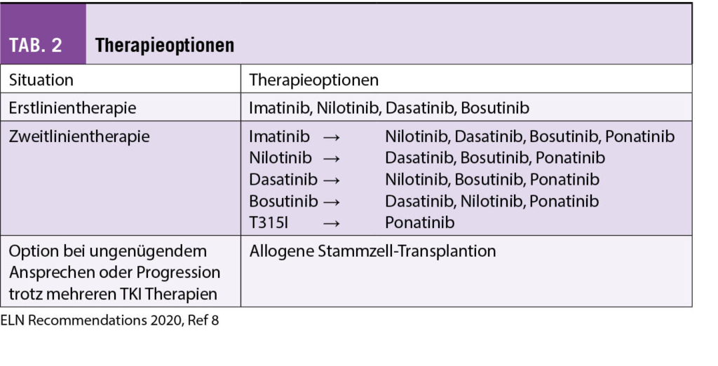 Die Wahl des Erstlinien-TKI bei Patienten mit neu diagnostizierter CML richtet sich primär nach dem Alter, dem Ziel der Therapie, den Komorbiditäten und dem potenziellen Nebenwirkungsprofil. Gemäss ELN 2020 Empfehlungen sind alle 4 TKI für die Erstlinientherapie geeignet (siehe Tabelle 2), wobei für Patienten mit einem hohen Risiko (siehe Risikostratifizierung und Zytogenetik) der Beginn mit einem Zweitgenerationen-TKI empfohlen wird (8).