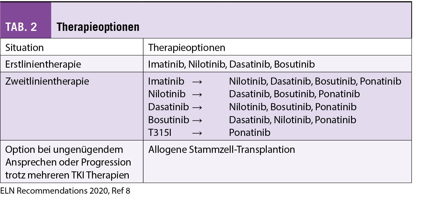 Bei inadäquater Wirkung oder Verlust des Ansprechens auf einen TKI sollten durch eine eingehende Anamnese sowie durch eine TKI-Plasmaspiegelbestimmung eine allfällig ungenügende Einnahme des TKI, Medikamenten-Interaktionen oder tiefere TKI-Plasma-Spiegel ausgeschlossen werden. Zudem gehört eine Standortbestimmung mit klinischer Untersuchung, Differentialblutbild, Knochenmarksuntersuchung, Zytogenetik mit Metaphasen-Karyotyp aus dem Knochenmark sowie eine BCR-ABL1 Mutationssuche dazu. Bei einer TKI-Resistenz auf Imatinib kann auf einen Zweitgenerationen-TKI gewechselt werden solange der Patient in CP ist und keine T315I Mutation aufweist. Die Wahl des Zweitgenerationen-TKI hängt bei allfälligen Mutationen von deren Profil ab. Ponatinib ist die einzige medikamentöse Option bei einer T315I Mutation; zudem sollte eine Evaluation für eine allogene hämatopoietische Stammzell-Transplantation diskutiert und evaluiert werden.