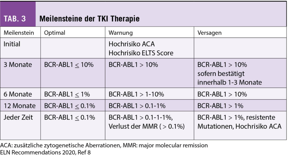 Nach Beginn der Erstlinientherapie mit einem TKI müssen das hämatologische und molekulare Ansprechen alle 3 Monate erfasst werden, damit beurteilt werden kann, ob der Patient die geforderten Ziele pro Meilenstein optimal erreicht oder ob die Therapie angepasst oder geändert werden muss. Vor einem Wechsel des TKI sollte jeweils eine ungenügende Medikamenteneinnahme ausgeschlossen werden. Nebenwirkungen, Interaktionen mit anderen Medikamenten oder Phytotherapeutika sowie vergessene Einnahmen können zu ungenügendem Therapieansprechen führen. In Tabelle 3 sind die Meilensteine und geforderten hämatologischen und molekularen Ziele dargestellt (8).