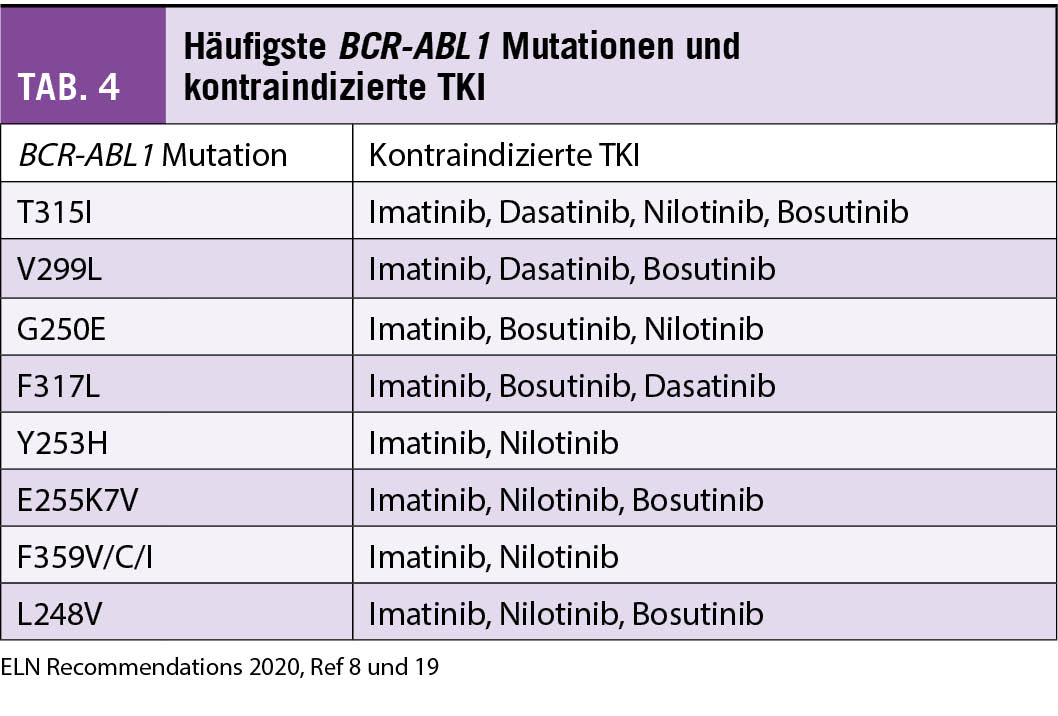 Die häufigste Ursache einer TKI-Resistenz sind Mutationen in der Kinase-Domäne des BCR-ABL1, welche die Medikamentenbindung behindern. Die häufigsten sind in Tabelle 4 aufgelistet, ebenso die jeweilig kontraindizierten TKI (8, 19). Mutationen werden häufiger bei sekundärer TKI-Resistenz oder bei CML in AP und BC gefunden. Solche müssen bei ungenügendem Ansprechen, bei Rezidiv oder Progression von einer chronischen in eine höhergradige Phase der CML gesucht werden. Diese Mutationssuche sollte mittels der sensitiveren «Next-Generation Sequencing (NGS)» Technologie erfolgen. Unter Imatinib ergibt sich das breiteste Spektrum von Mutationen; bei den Zweitgenerationen-TKI ist das Mutationsspektrum bereits eingeschränkter, allerdings sind die wenigen Mutationen oft mit höherer TKI-Resistenz assoziiert. Insbesondere ist die hoch-resistente T315I Mutation zu erwähnen, welche nur durch eine Therapie mit dem dafür entwickelten Ponatinib angegangen werden kann (siehe Tabelle 2).