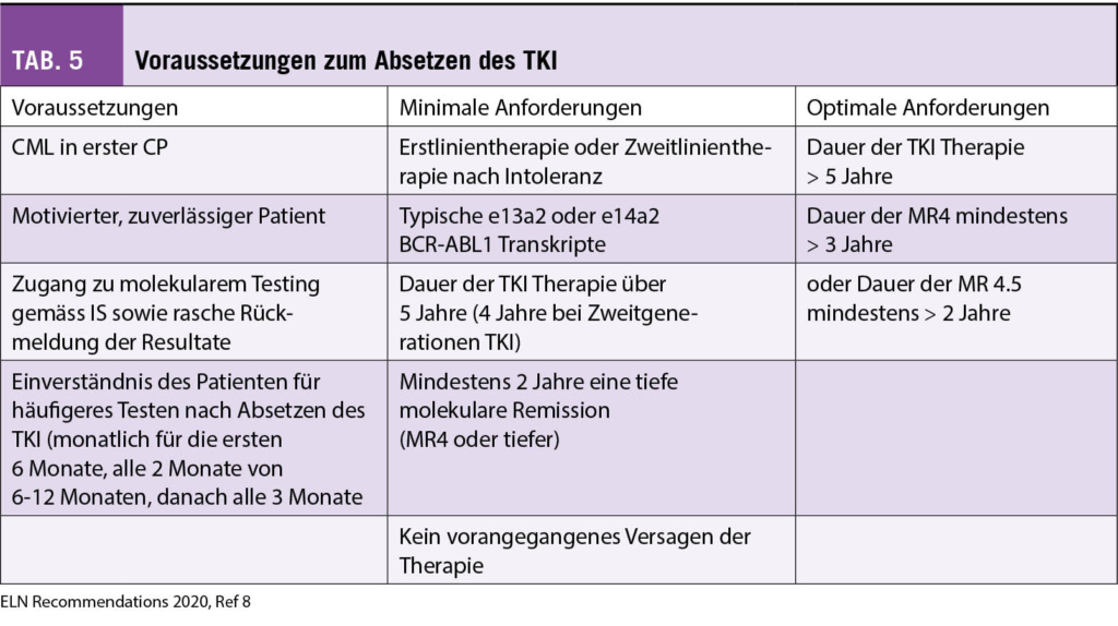 Vor allem für jüngere Patienten und um Langzeit-Nebenwirkungen unter TKI Therapie zu vermeiden, wird heute das Ziel einer TFR angestrebt (8). Durch die STIM Studien (Stopp Imatinib Studien) und weiteren Stopp TKI Studien in der Folge haben wir gelernt, dass ca. 40-60% der Patienten, welche ein BCR-ABL1 von mindestens einer MR4-4.5 IS über 2 Jahre erreicht haben, rezidiv frei bleiben (20). Längere TKI-Exposition sowie längere Dauer eines sehr tiefen molekularen Ansprechens erhöht die Wahrscheinlichkeit für eine TFR, wohingegen Patienten mit einem initial hohen Risiko-Score (Sokal) ein höheres Rezidivrisiko aufweisen. In Tabelle 5 sind die Voraussetzungen und Kriterien gemäss ELN Empfehlungen für ein TKI-Absetzen aufgelistet (8). Zweitgenerationen TKI als Erstlinientherapie führen schneller zu einer höheren Rate an Patienten mit tieferem molekularem Ansprechen, was beim Ziel TFR für den Einsatz der Zweitgenerationen-TKI spricht, jedoch können diese mit gewissen Risiken und Nebenwirkungen verbunden sein, so dass für den einzelnen Patienten eine Risiko-Nutzen Abwägung durchgeführt werden sollte. Die meisten Rückfälle nach Absetzen des TKI erfolgen in den ersten 6-12 Monaten, und bei Rezidiv führt der Wiederbeginn des entsprechenden TKI in der Regel wieder zu demselben molekularen Ansprechen. Zu beachten ist, dass ca. 20-30% der Patienten, insbesondere solche mit einer vorbestehenden Arthritis, ein TKI-Absetzsyndrom mit muskulo-skelettalen Schmerzen entwickeln können. Dieses kann mit antiinflammatorischen Schmerzmitteln und kurzzeitigem Einsatz von Steroiden behandelt werden (21).