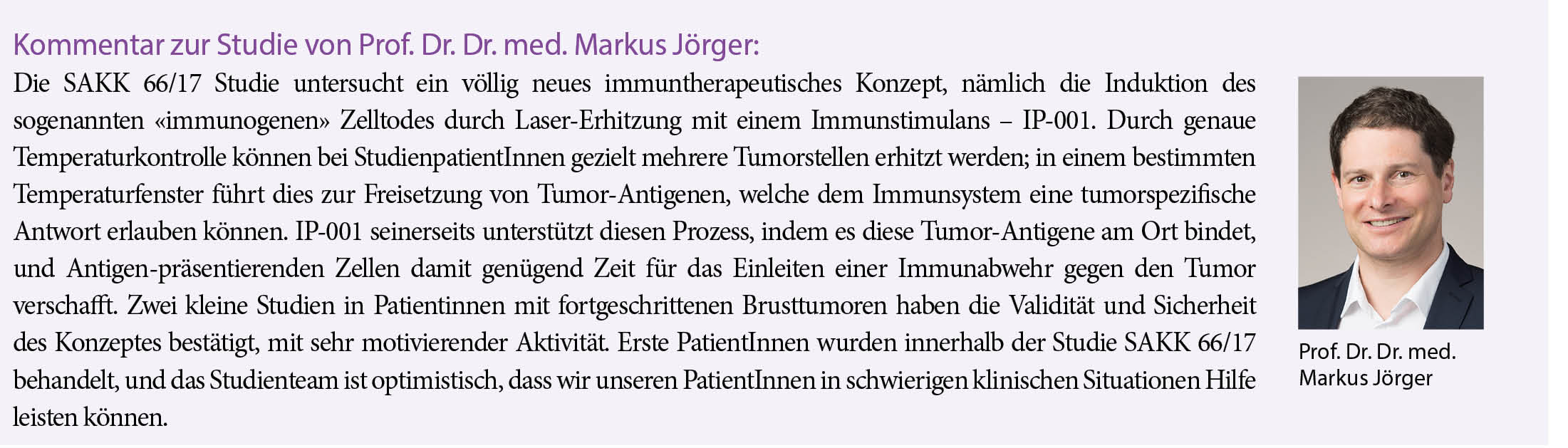 In der Studie SAKK 66/17 wird ein Therapieverfahren geprüft, das einen therapeutischen Benefit verspricht, wenn Immun- und Chemotherapie nicht mehr wirken: die thermale Ablation eines Tumorknotens mit anschliessender intratumoraler Injektion der Substanz IP-001. Dieses Verfahren soll «kalte» zu «heissen» Tumoren umwandeln, also eine lokale Immunantwort anregen, so dass der behandelte Tumor schrumpft. Zudem besteht die Hoffnung, dass eine systemische Immunreaktion erfolgt, die sich auch gegen Krebszellen fernab vom behandelten Tumorknoten richtet. IP-001 ist ein Immunstimulans, das momentan weder als Monotherapie noch in Kombination mit thermaler Ablation zugelassen ist.