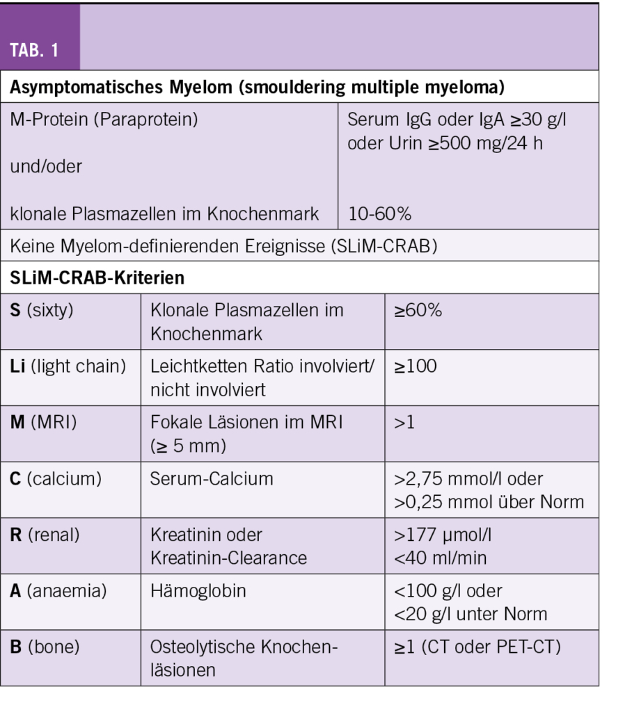 Das asymptomatische Myelom, auch smoldering multiple myeloma (SMM) genannt, wurde durch die International Myeloma Working Group 2014 neu definiert. Während vorher ein M-Protein im Serum ≥ 30 g/l und/oder eine Knochenmarksinfiltration von ≥ 10% klonaler Plasmazellen sowie das Fehlen von Endorganschäden und Symptomen als Kriterien galten (1), wurden die Diagnosekriterien 2014 folgendermassen angepasst (2):