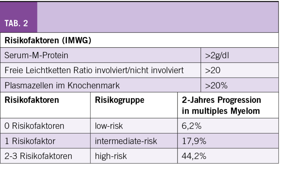 Risikofaktoren für eine Progression des SMM in ein multiples Myelom sind gemäss einer Untersuchung der Mayo-Klinik ein M-Gradient von ≥ 30 g/l, ≥ 10% klonale Plasmazellen im Knochenmark und eine Ratio der freien Leichtketten < 0,125 oder > 0,8. Die spanische Studiengruppe definierte als Risikofaktoren ≥ 95% abnormale Plasmazellen und eine Immunoparese, d.h. eine Reduktion der nicht involvierten Immunglobulinen (6). Zur Risikostratifizierung des SMM werden durch die IMWG drei Risikofaktoren definiert: M-Protein > 2 g/dl, FLC Ratio > 20, Knochenmarksinfiltration > 20% (Tab. 2) (7). Ohne Risikofaktor (low-risk) liegt das Risiko für eine Progression nach 2 Jahren bei 6,2%, mit einem Risikofaktor (intermediate-risk) bei 17,9% und bei 2-3 Risikofaktoren (high-risk) bei 44,2%. Wenn zusätzlich die Zytogenetik berücksichtigt wird und als zusätzlicher Risikofaktor eine t(4;14), t(14;16), +1q und/oder eine del13q/Monosomie miteinbezogen werden, erfolgt eine Aufteilung in vier Risikogruppen mit einer Progressionsrate nach 2 Jahren von 6,0% (low-risk) bis 63,1% (high-risk).